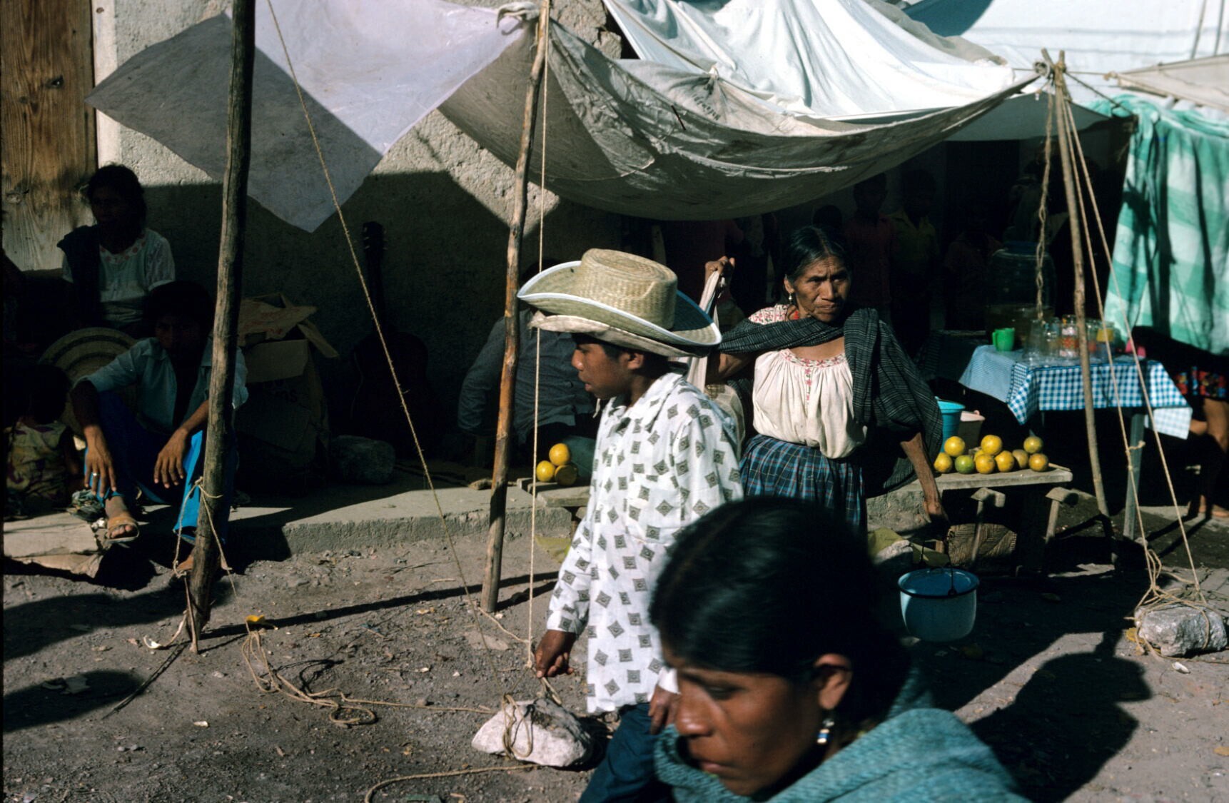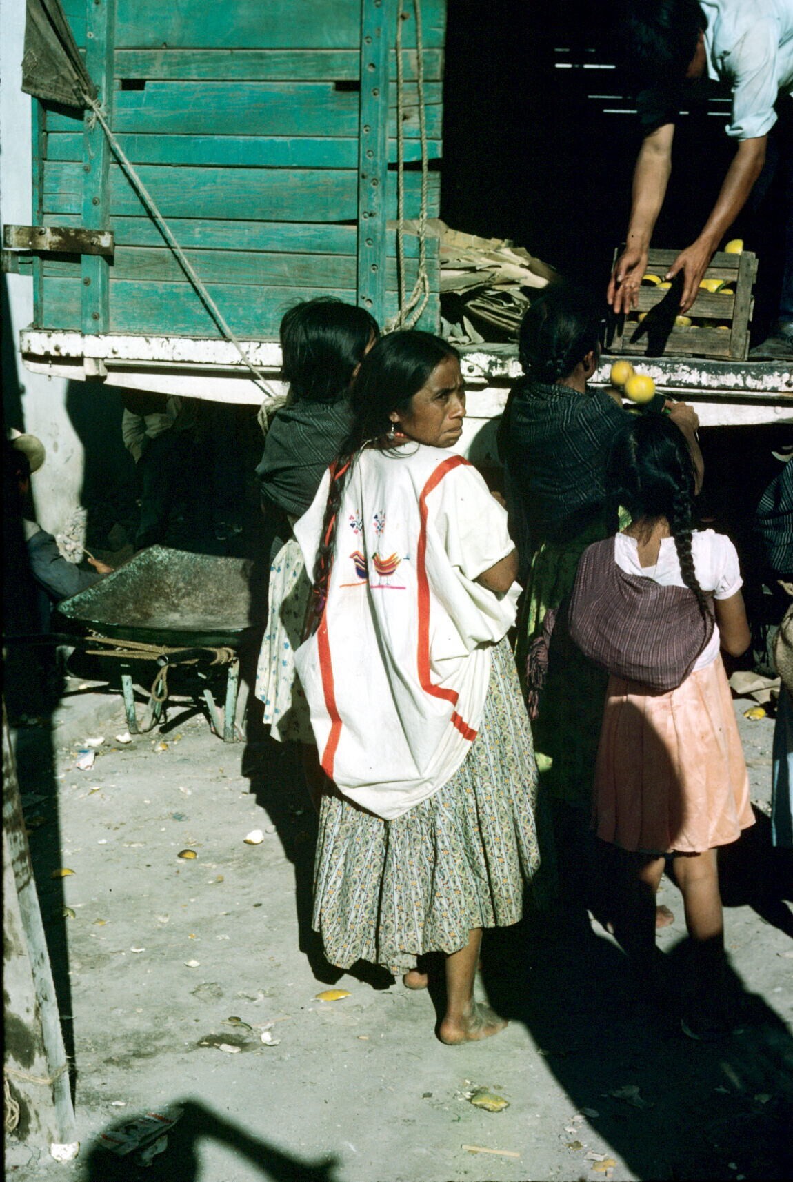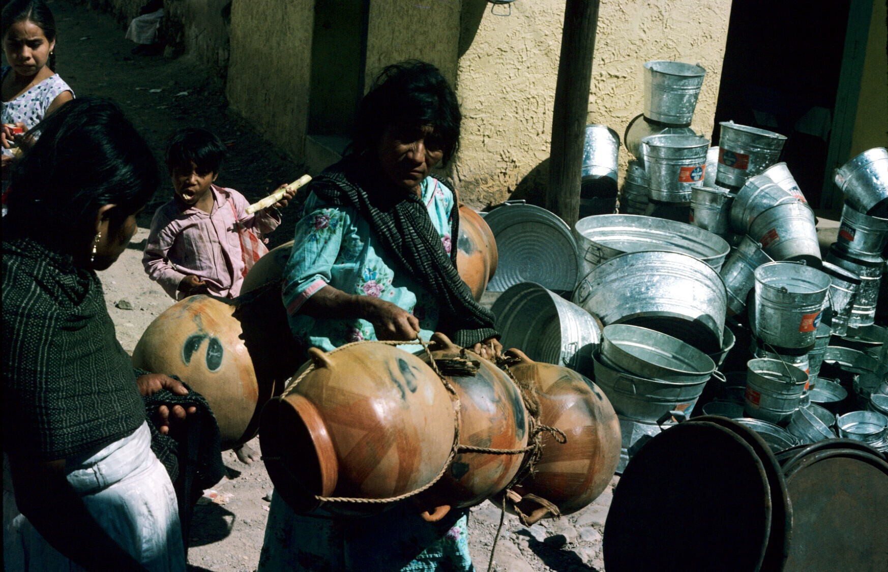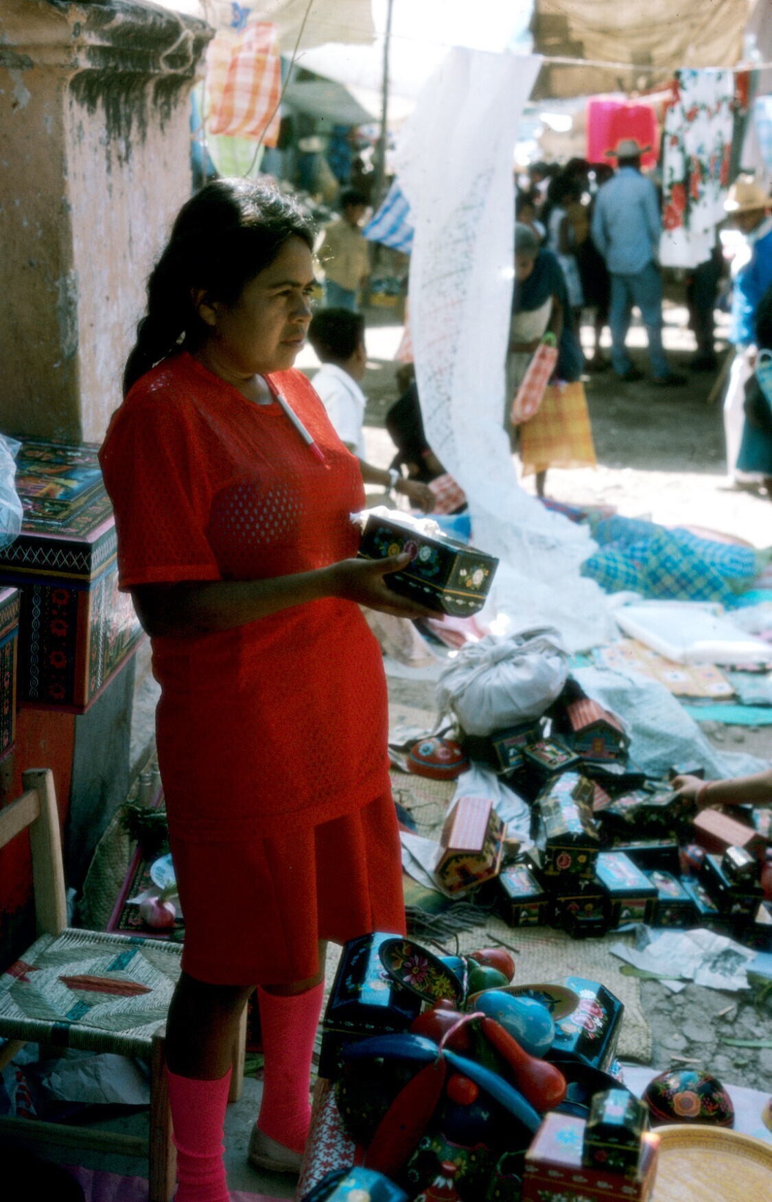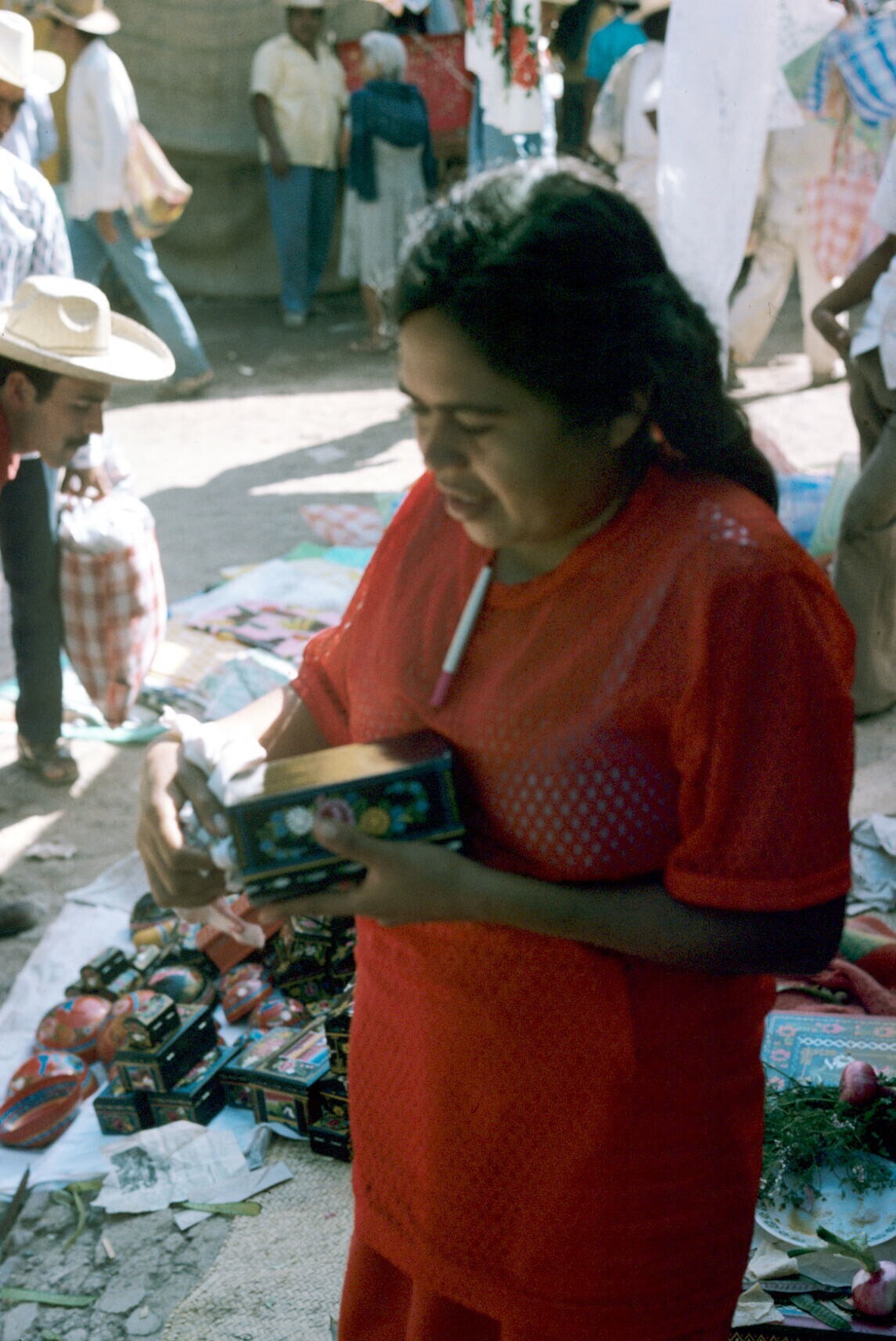 vrouw met lakwerk uit Olinalá op markt