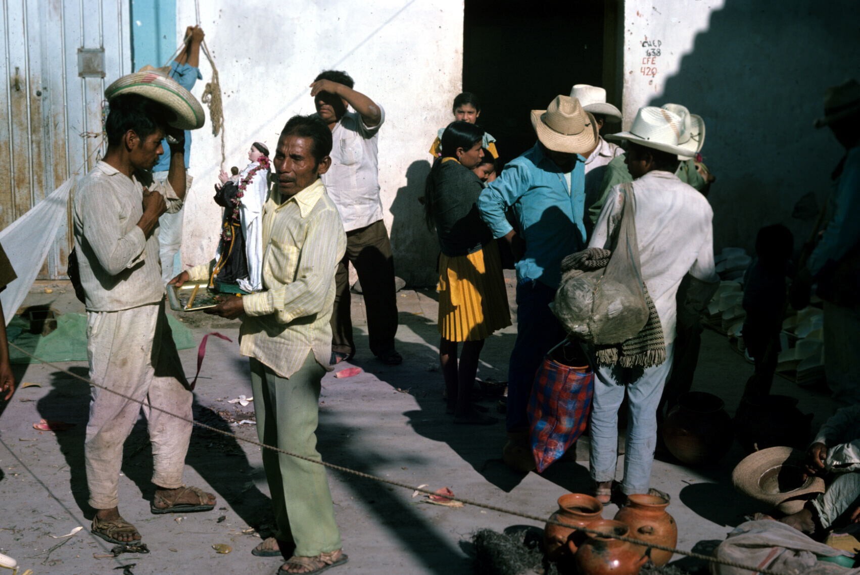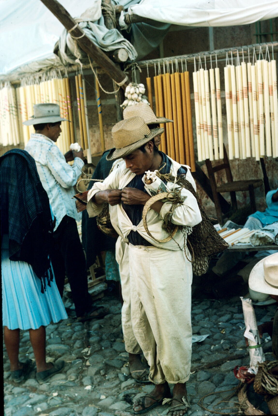 mannen in traje indio bij kaarsenkraam op markt
