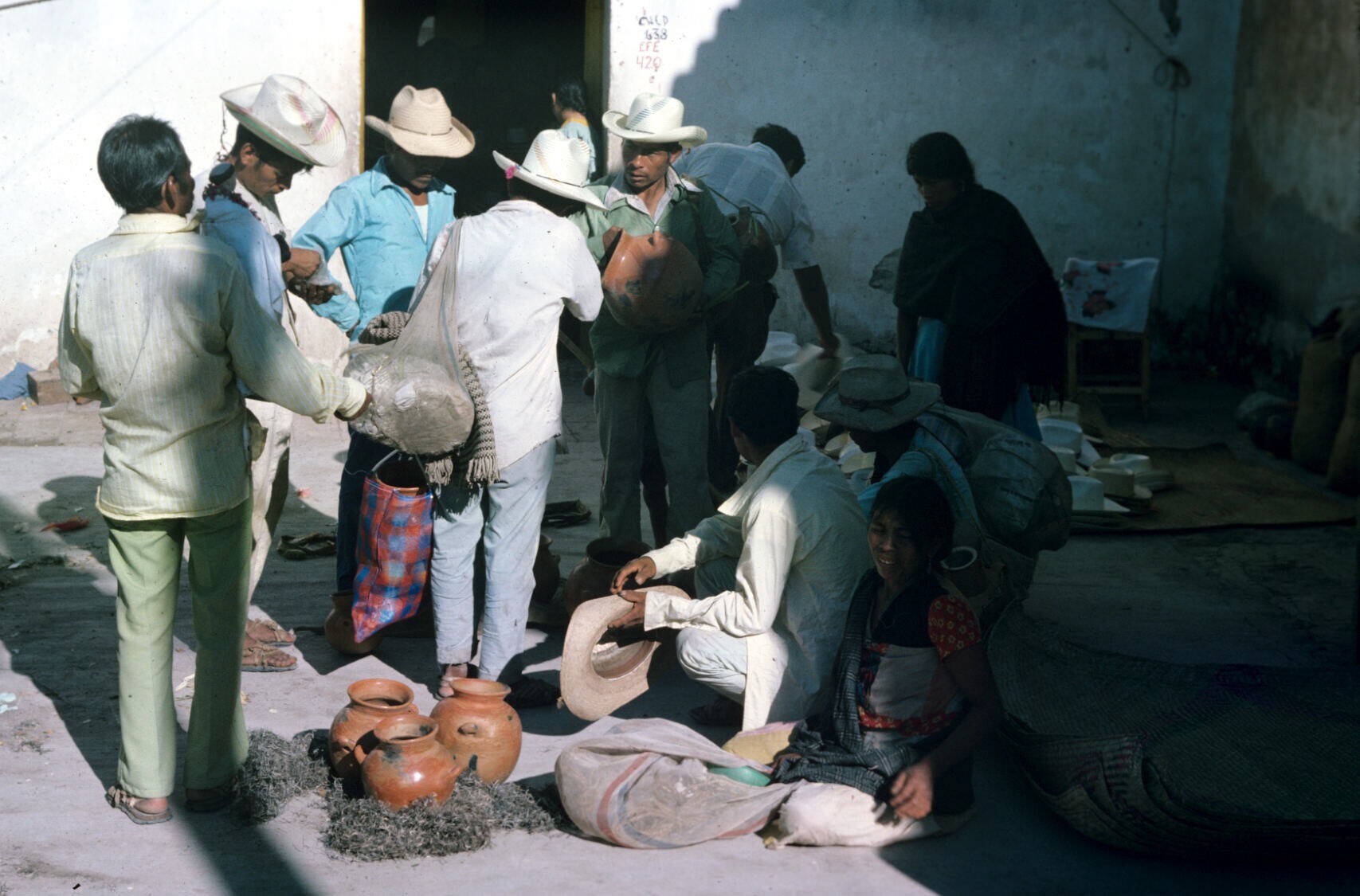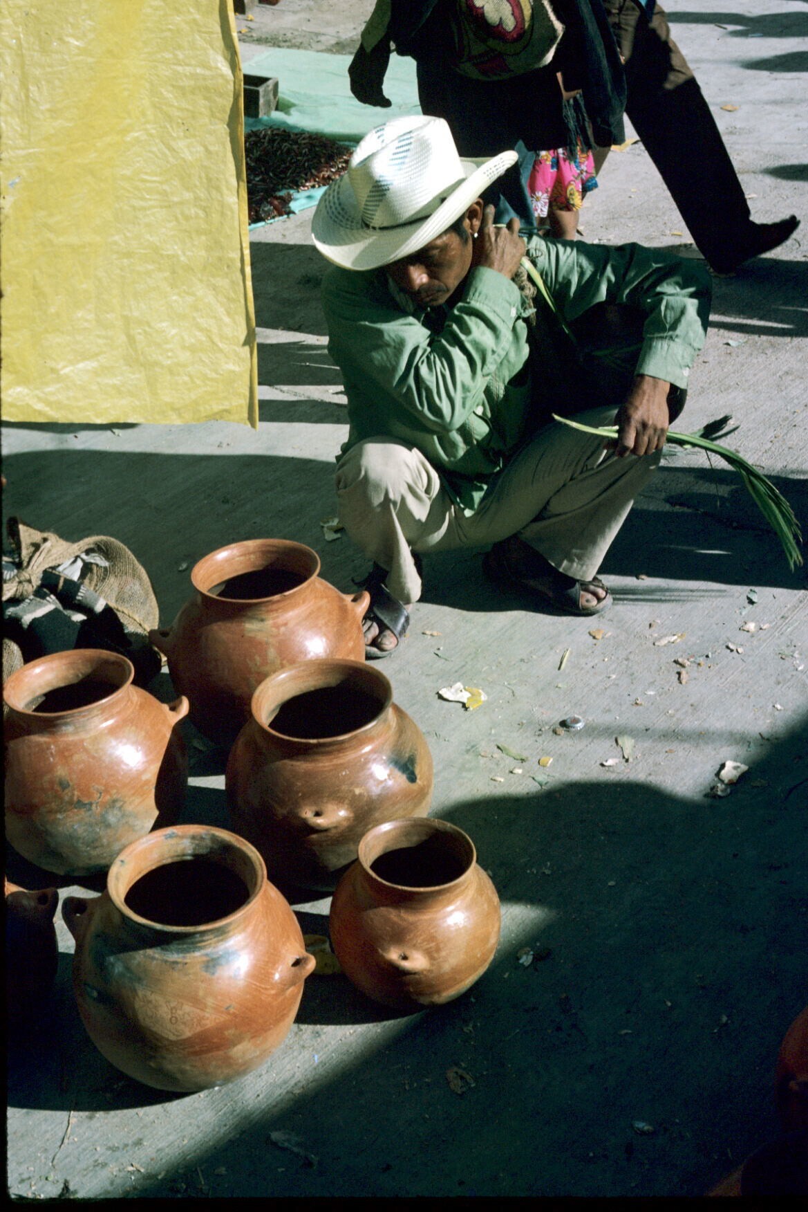 mannen bij aardewerkverkoop op markt