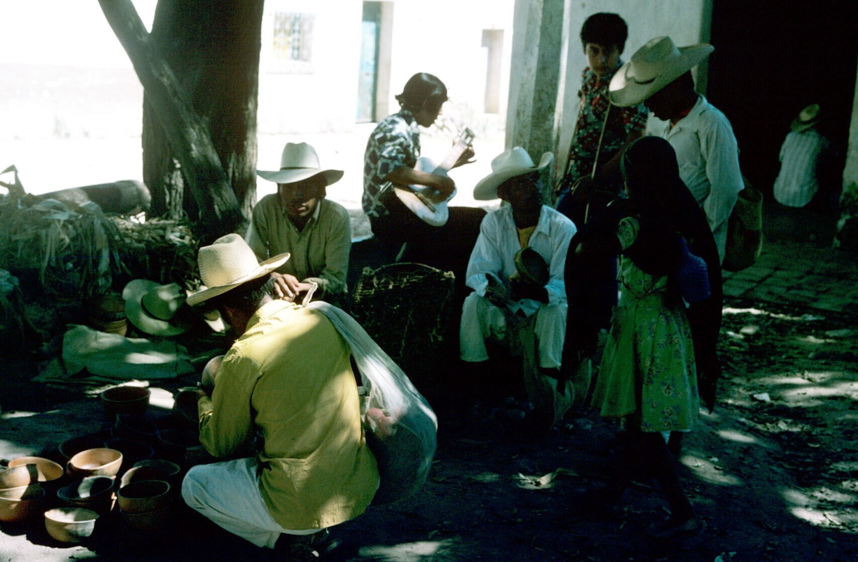 markttafereel met gitarist en aardewerk