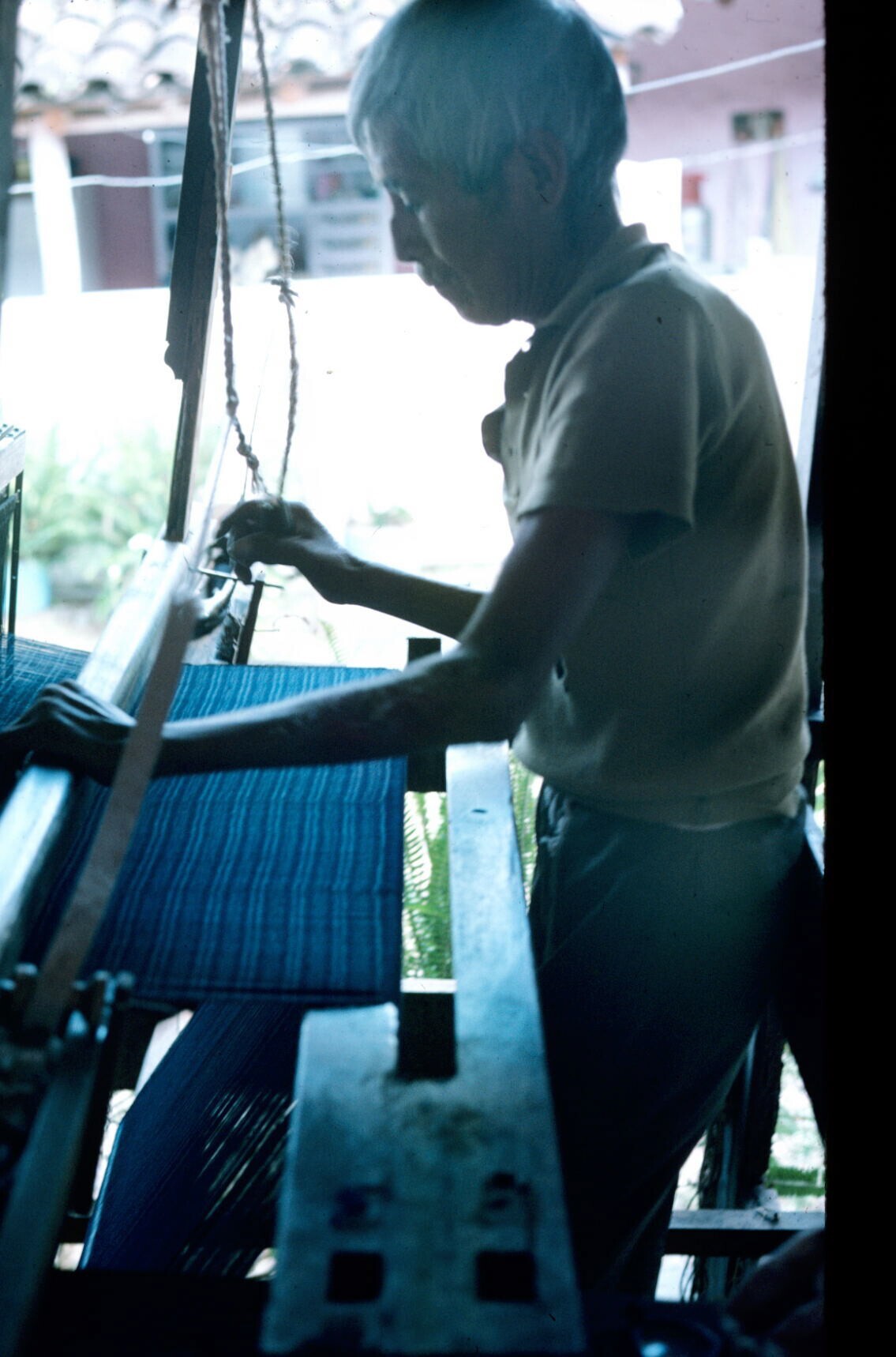 man, wevend op koloniaal weefgetouw