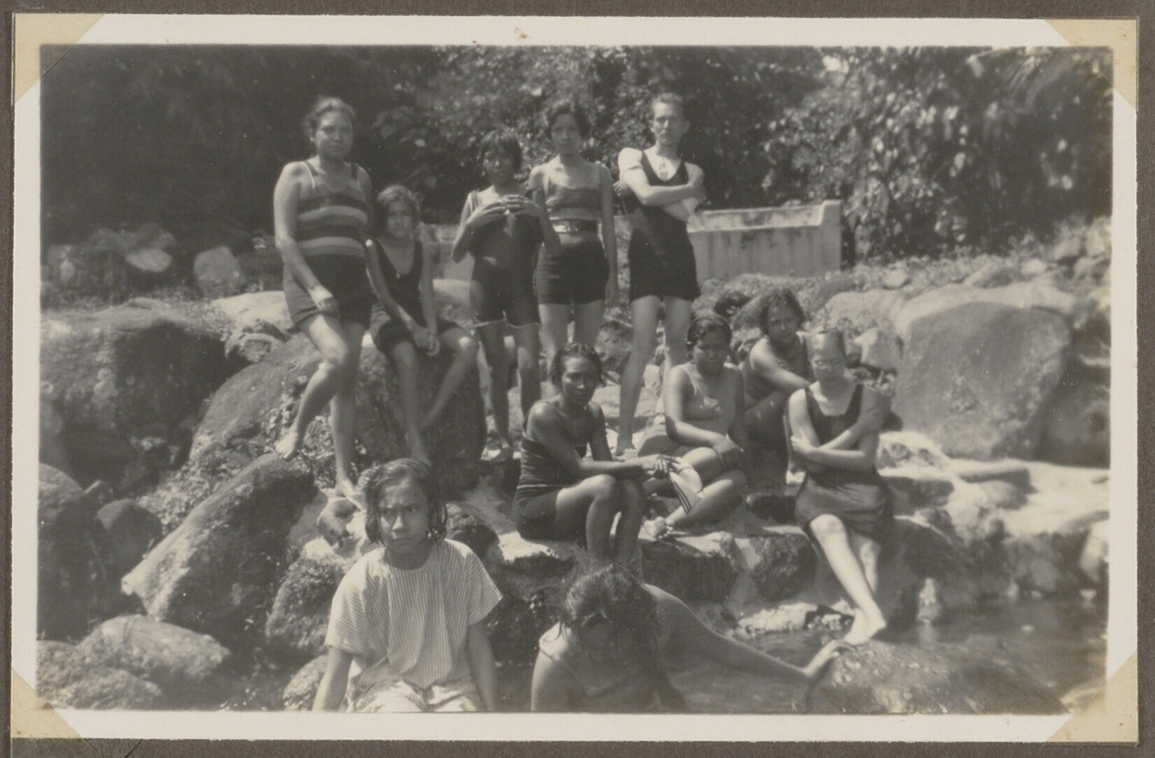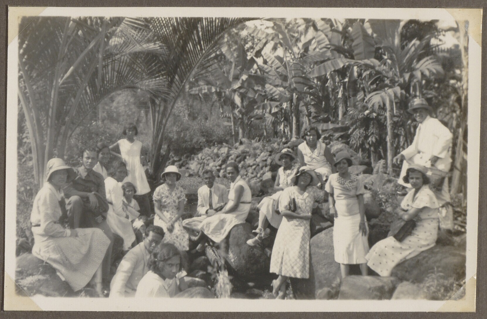 Gezelschap op rotsen, op de achtergrond bomen