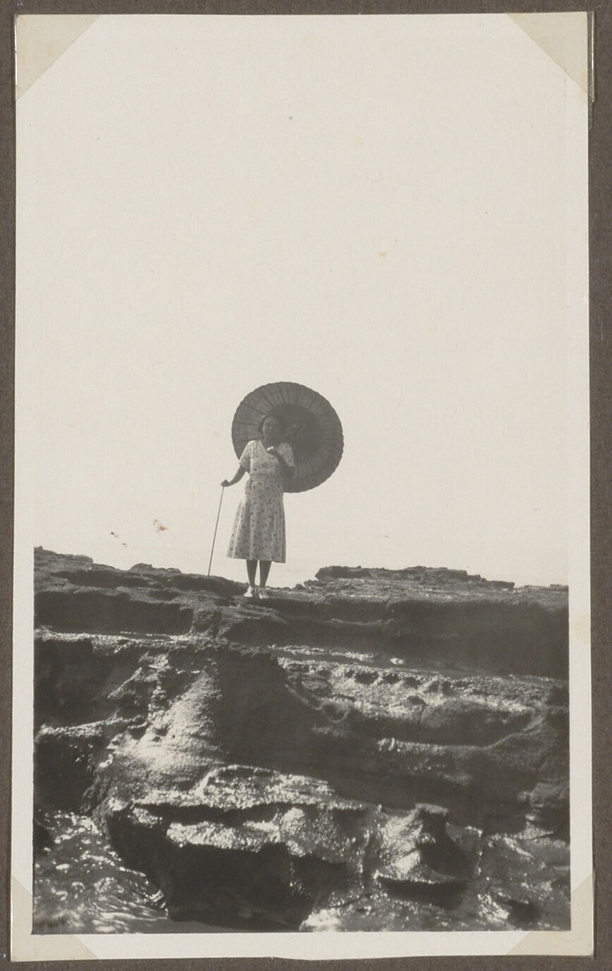 Portret van vrouw met parasol op een rots