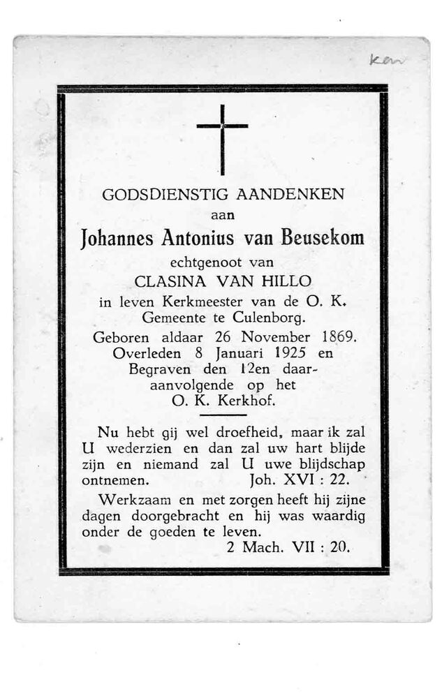 bidprent voor Johannes Antonius van Beusekom. Gebore...