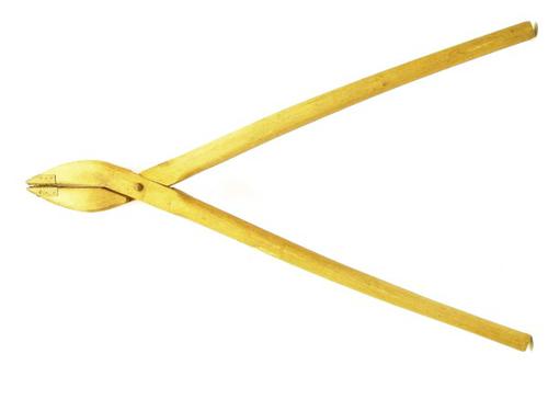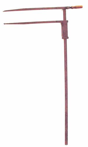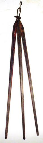 Driepoot van hout met metaalbeslag gebruikt bij de m...