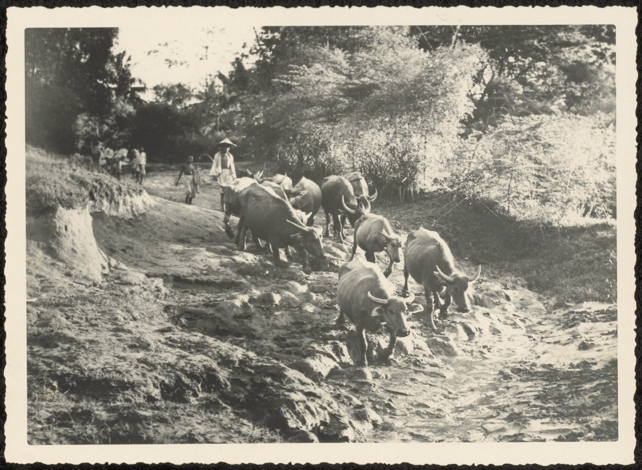 Een man drijft een kudde karbouwen