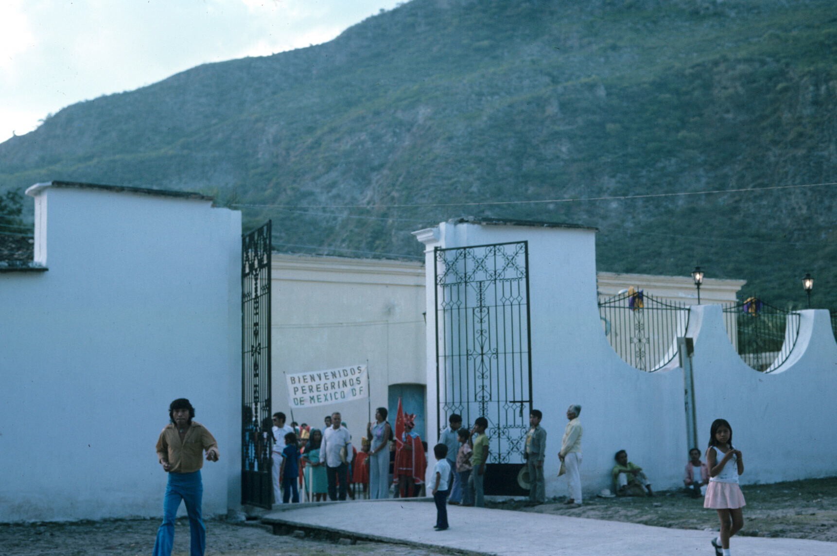 ingangshek in kerkmuur (spandoek heet pelgrims welkom)