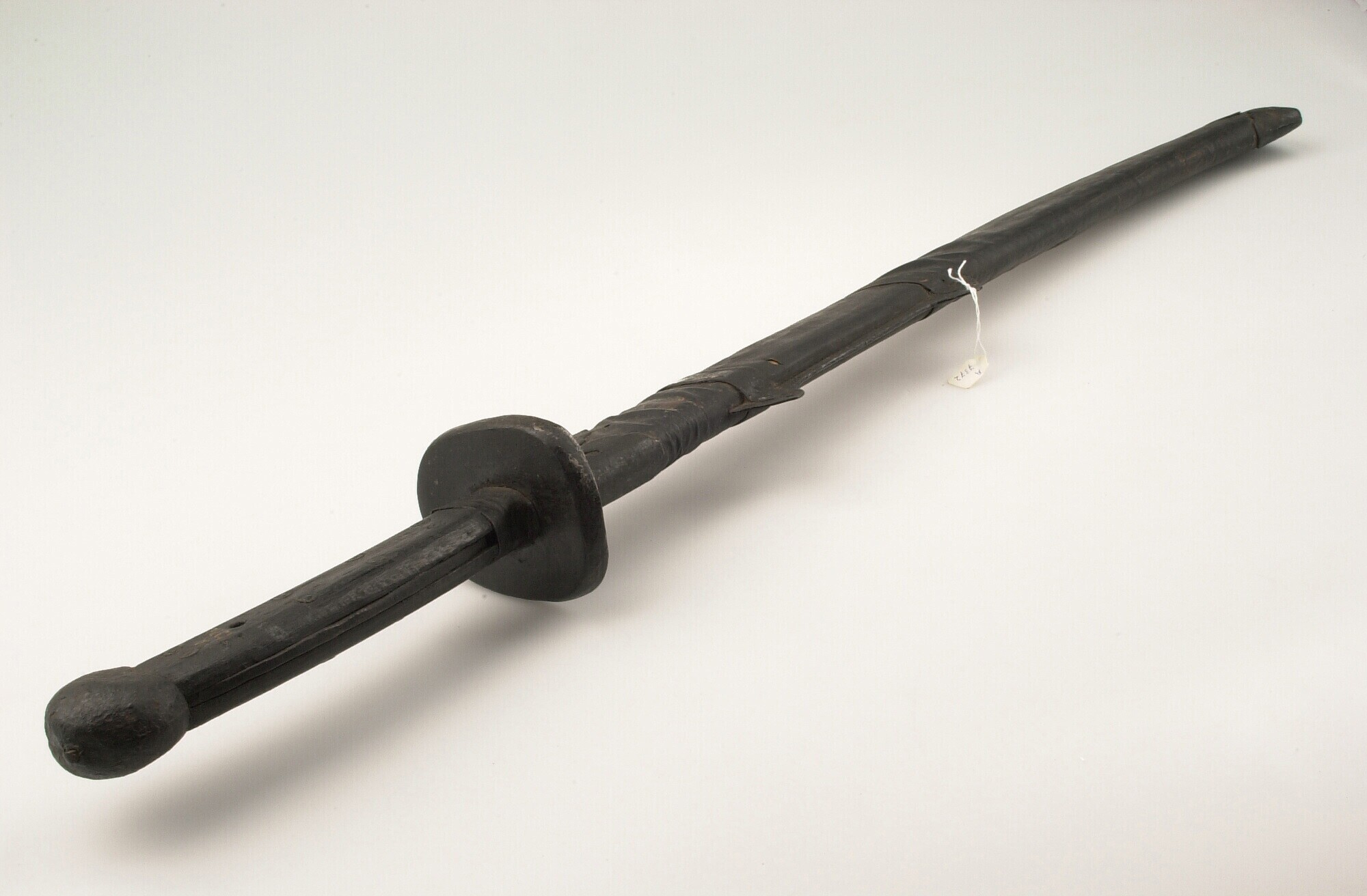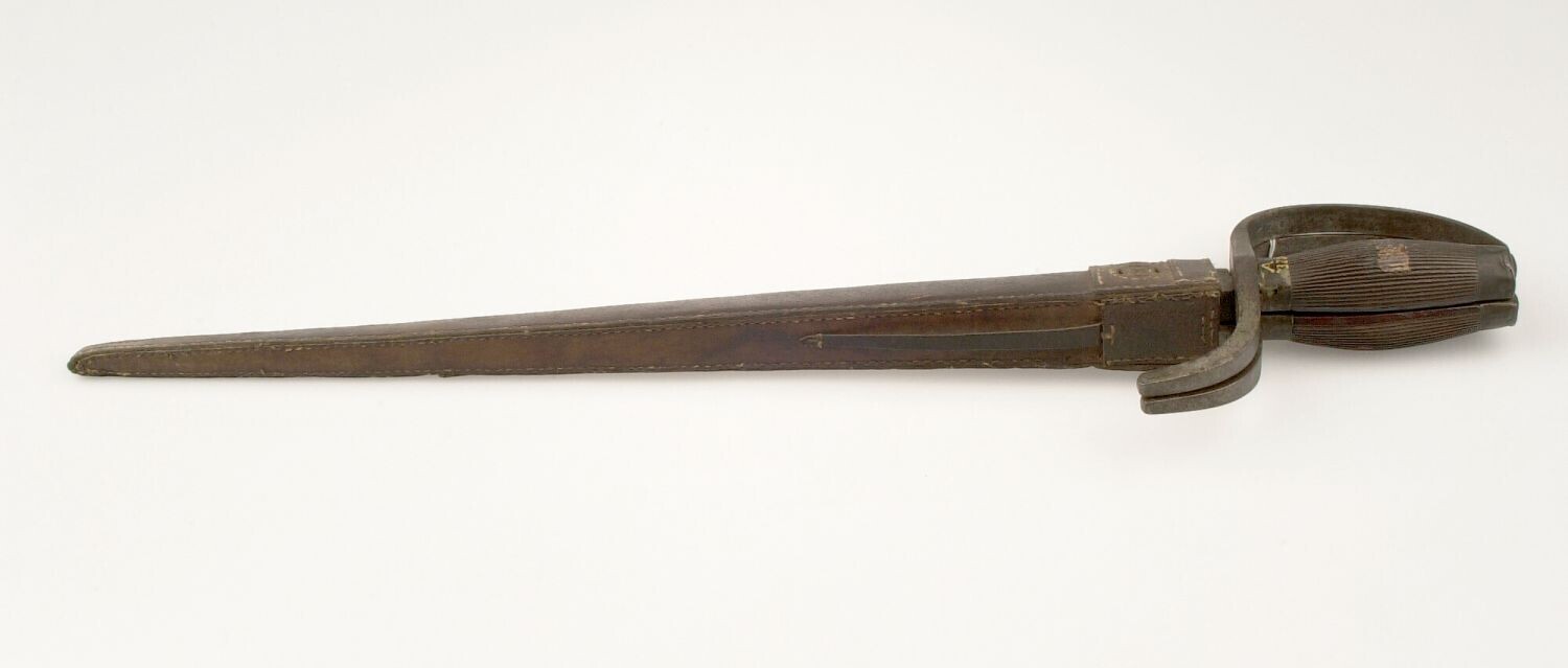 Sabel met zwart houten gevest en houten, met leer be...