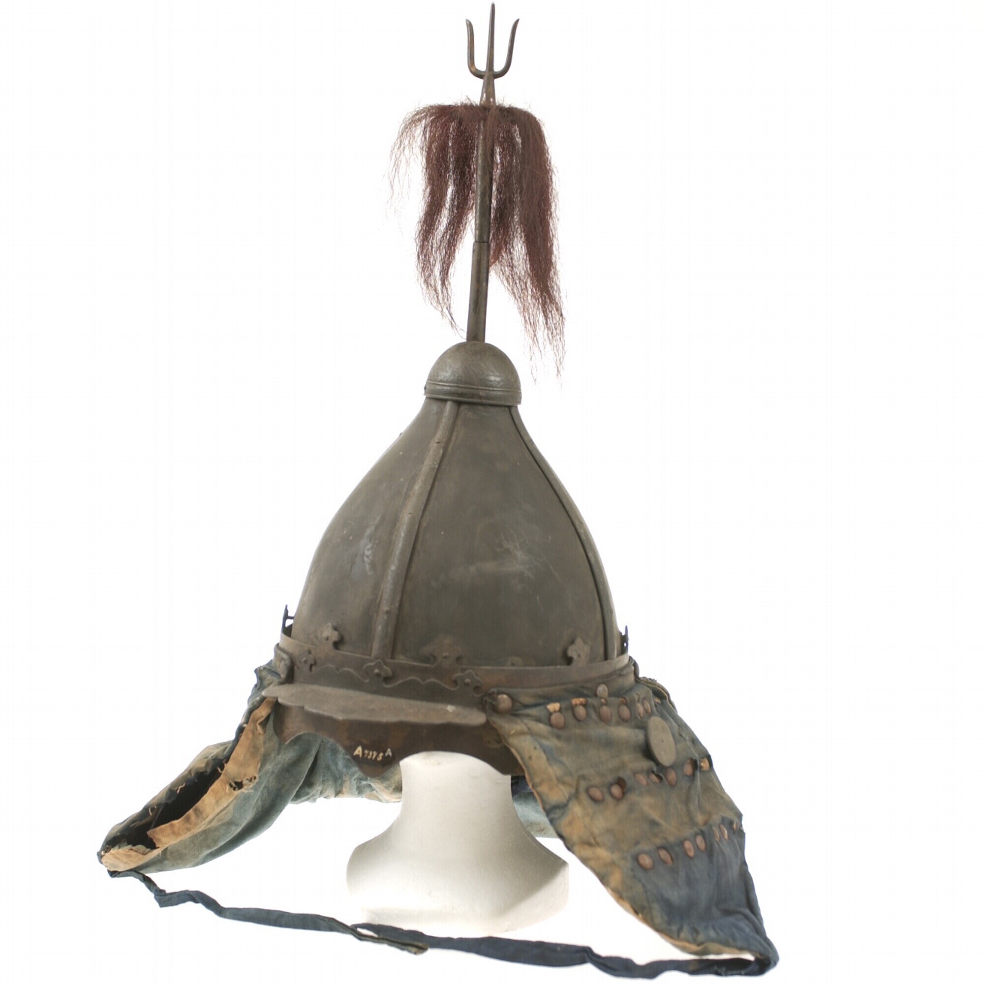Helm van ijzer met een drietand, rode pluim en nekbe...