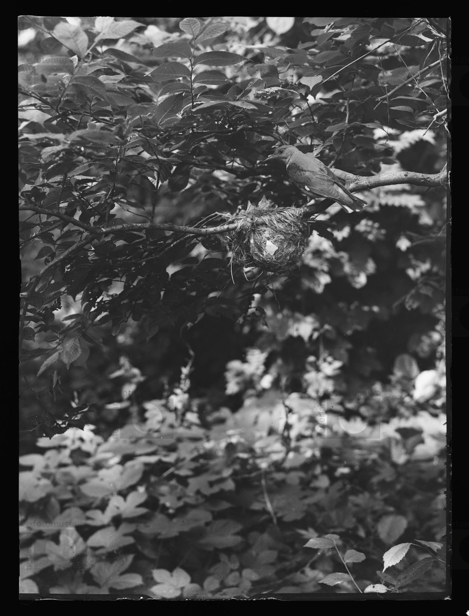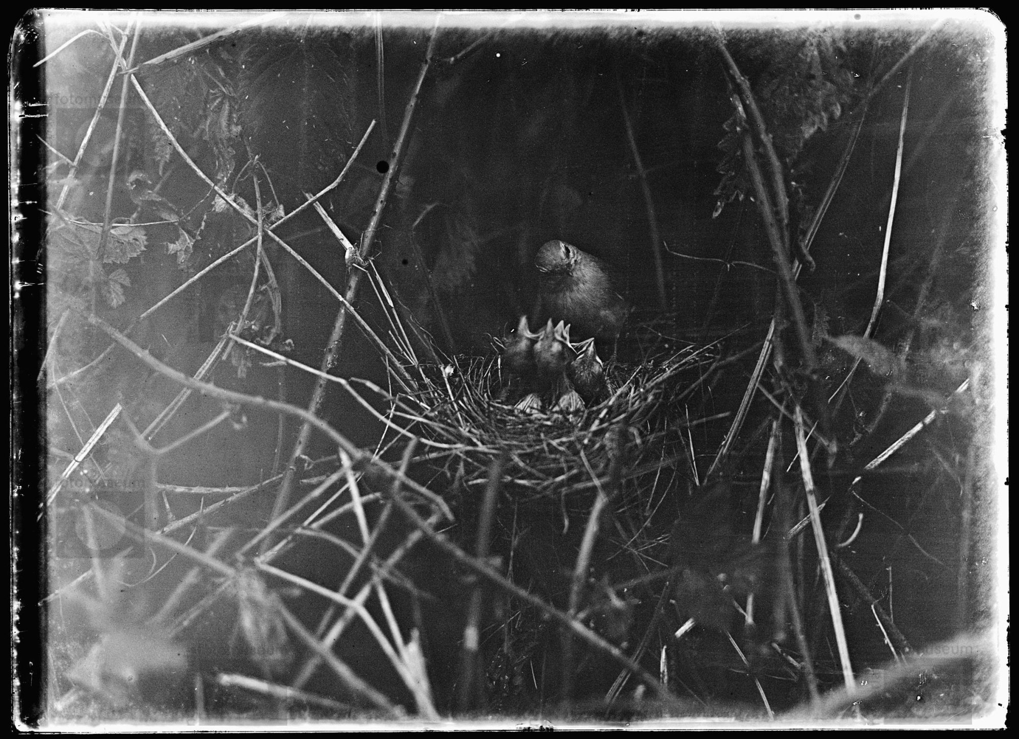 Tuinfluiter met voer bij nest met jongen, Voorst (1918)
