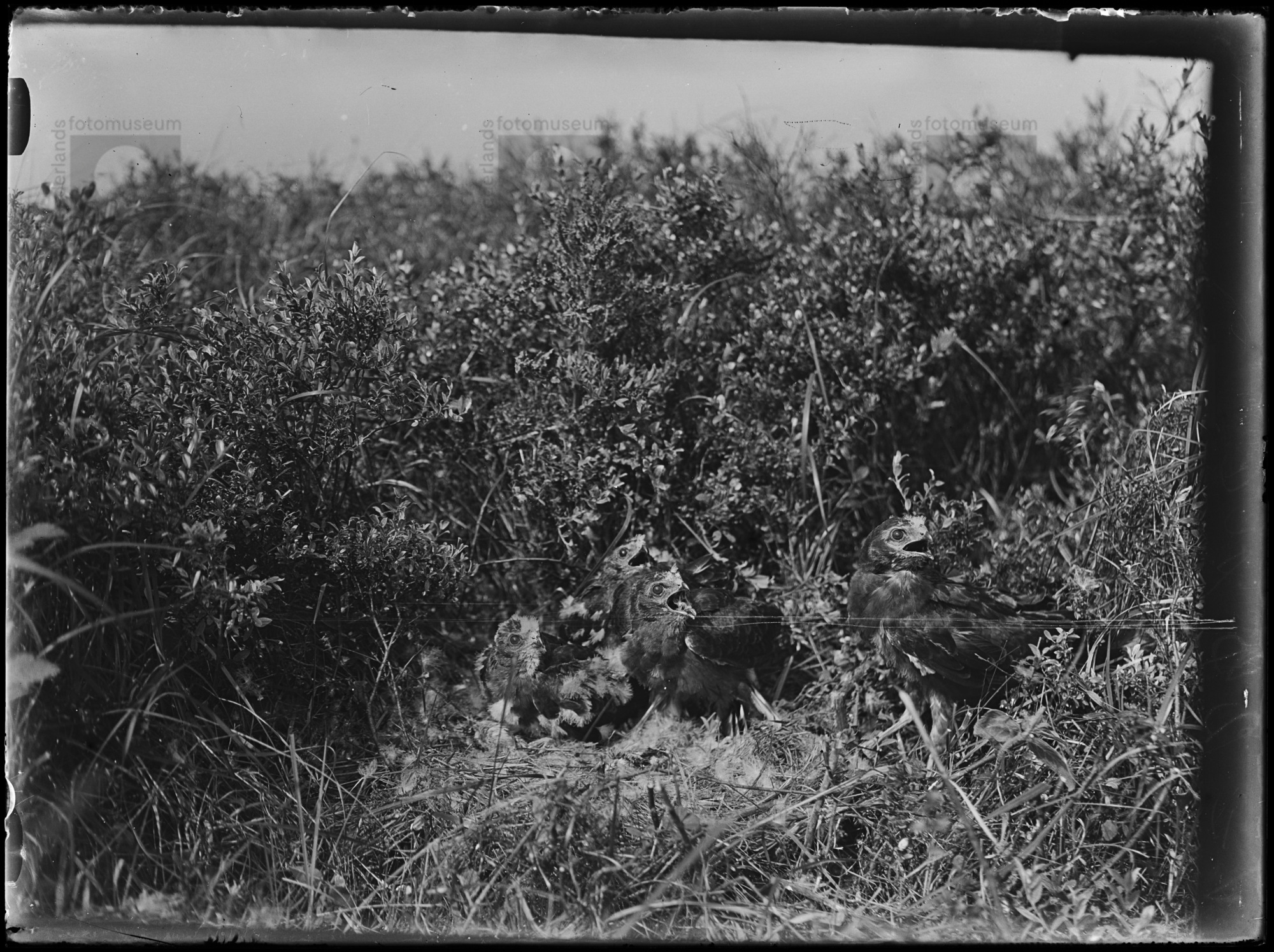 Jonge Grauwe kiekendieven in nest, De Krim (1923)
