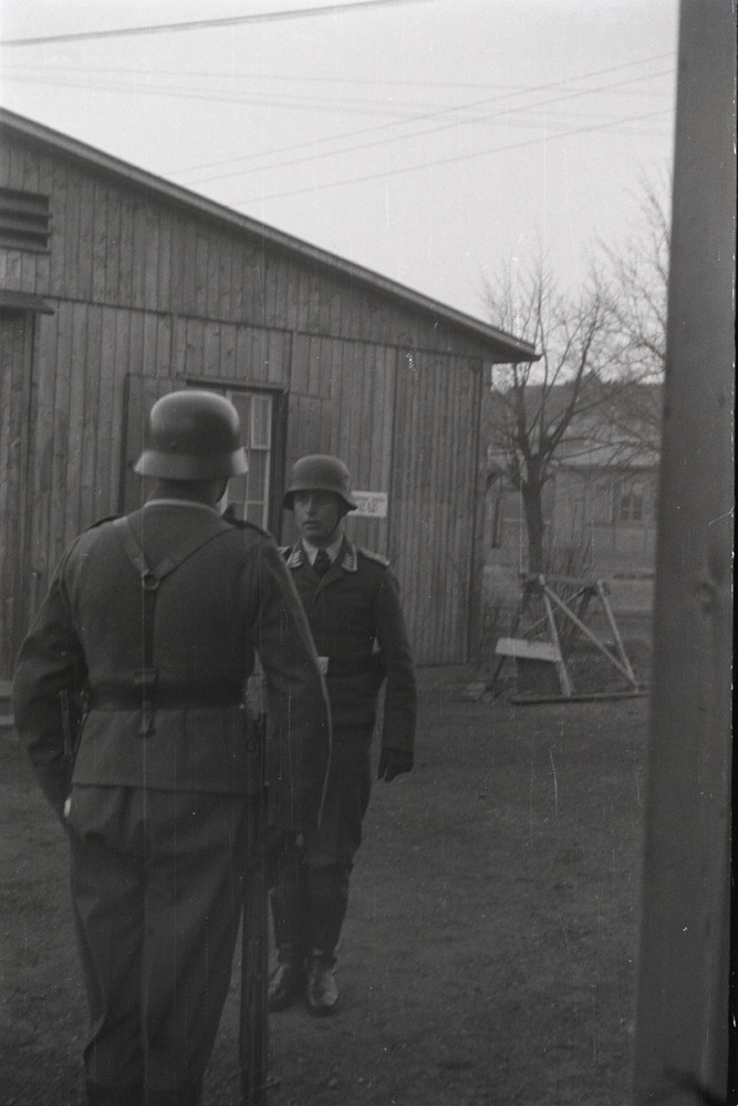 Overdracht van de wacht bij een barak.