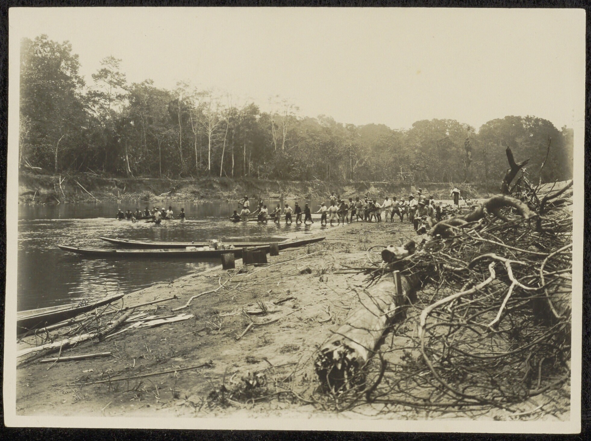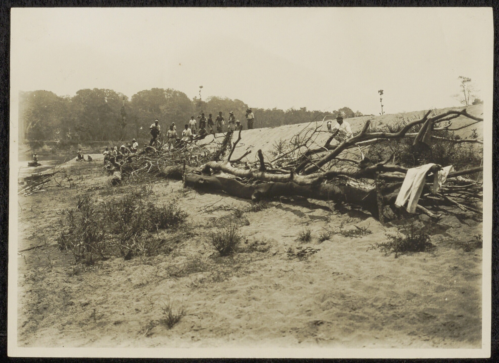 Mensen aan de oever van een rivier in een ontgonnen ...