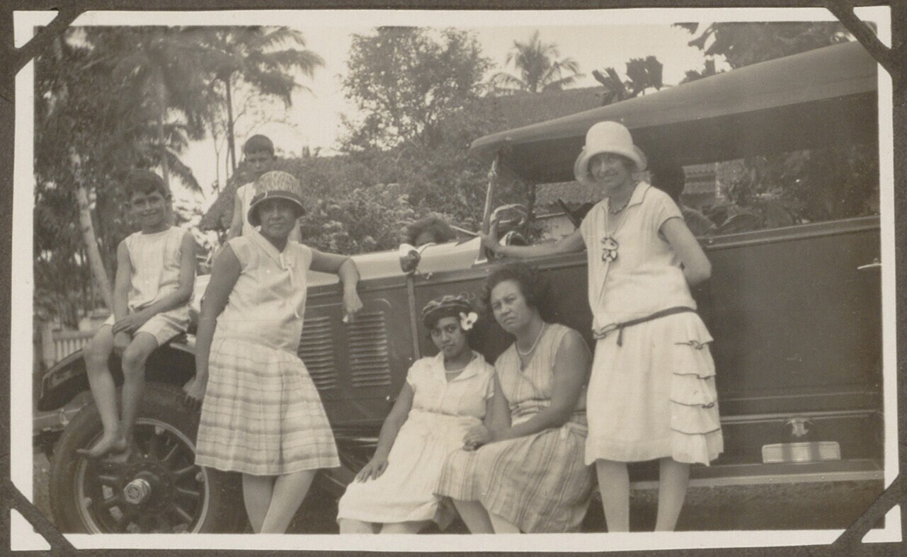 Portret van vier vrouwen en twee jongens die bij een...