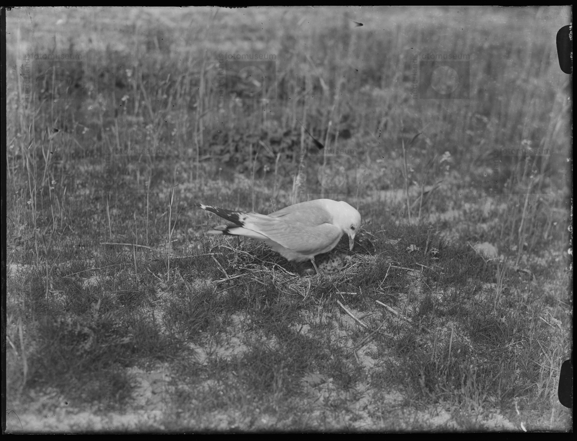 Stormmeeuw staand boven nest, Geversduin (1949)