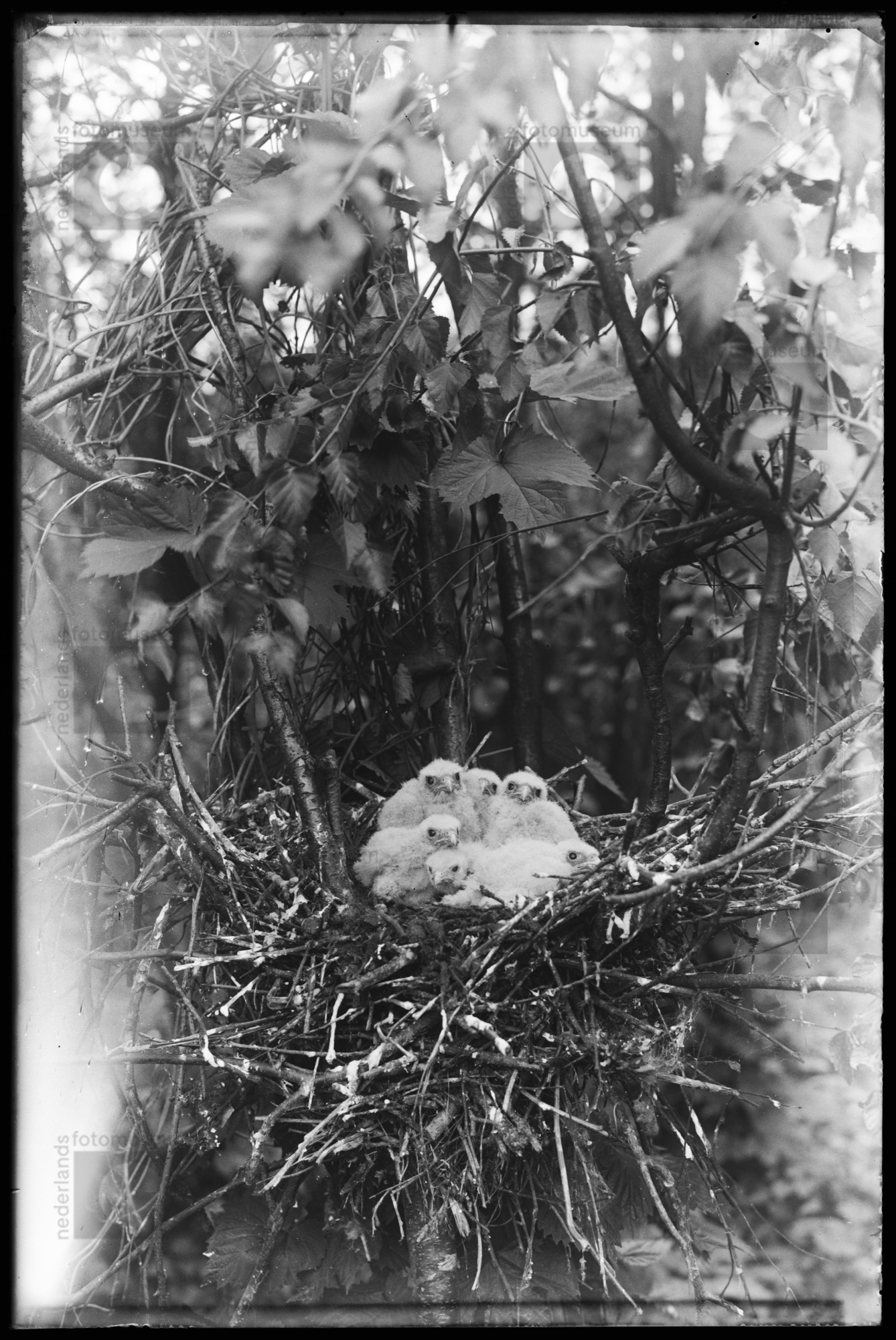 Blauwe reiger op nest met jongen, Sloten, (1928)