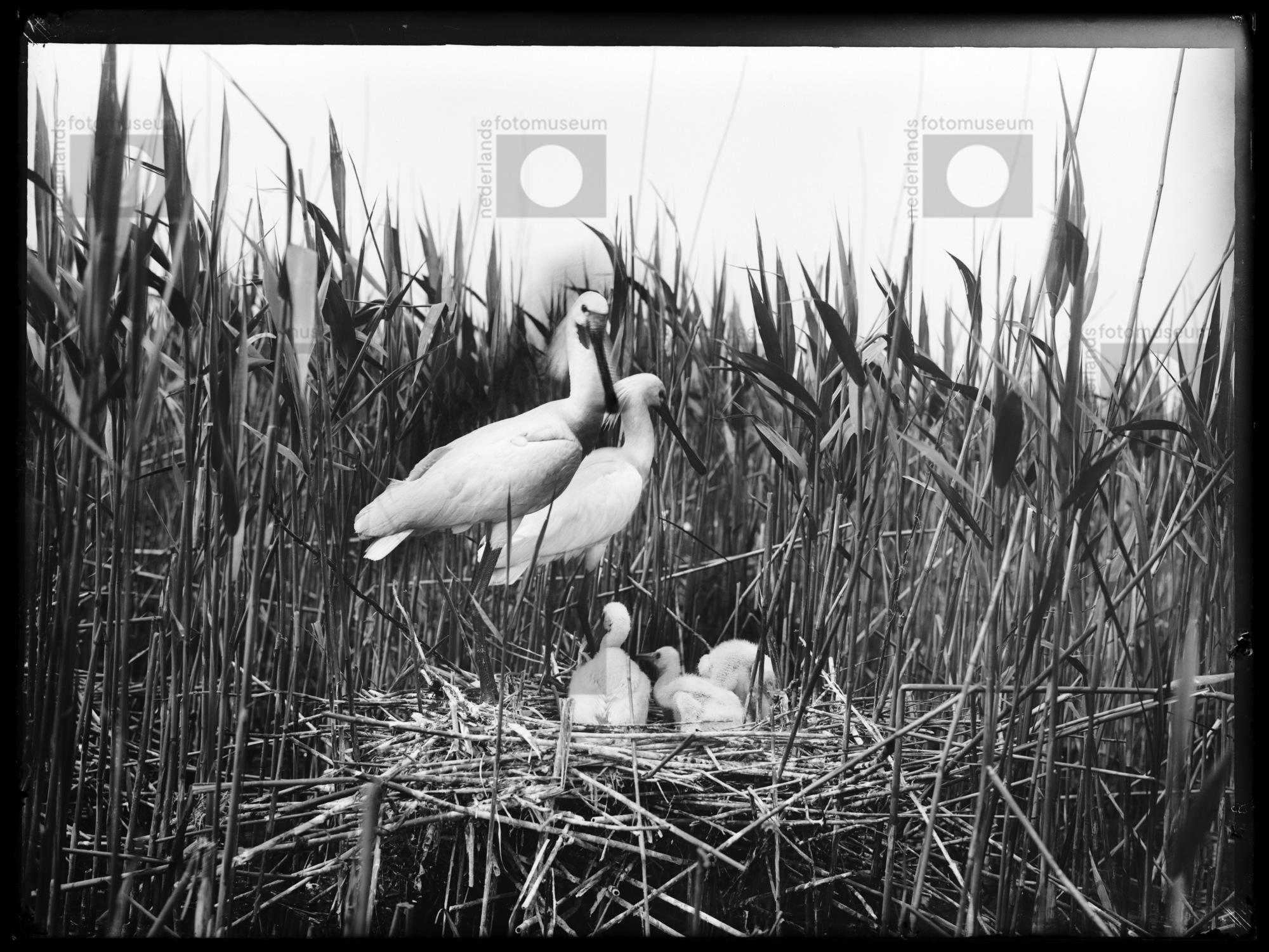 Nest met oude en jonge Lepelaars, Naardermeer (1905)