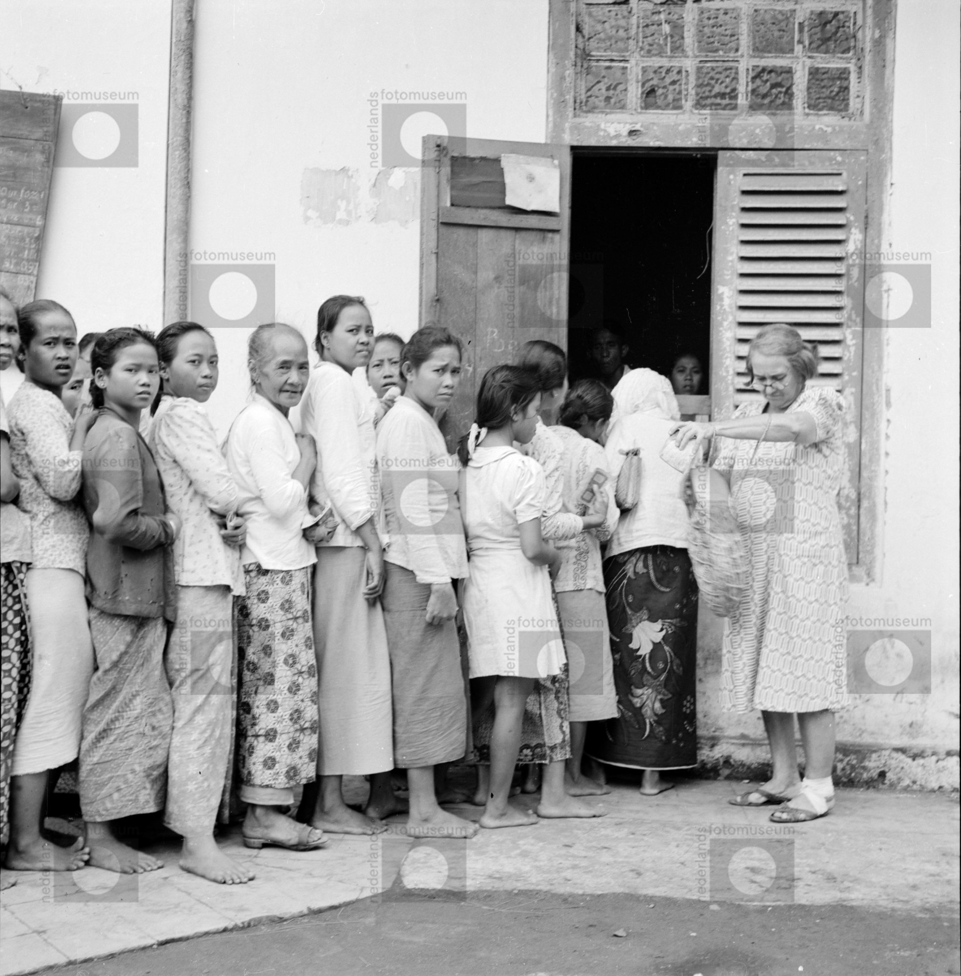 Rij vrouwen staat voor ingang van gebouw te wachten ...
