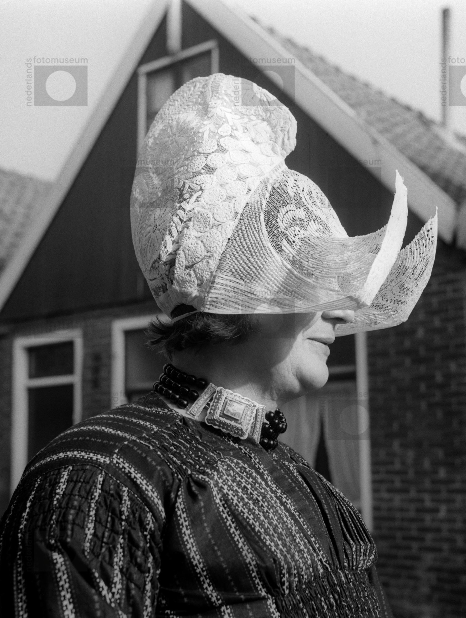 Vrouw in door-de-weekse kerkdracht, Volendam (1950-1...