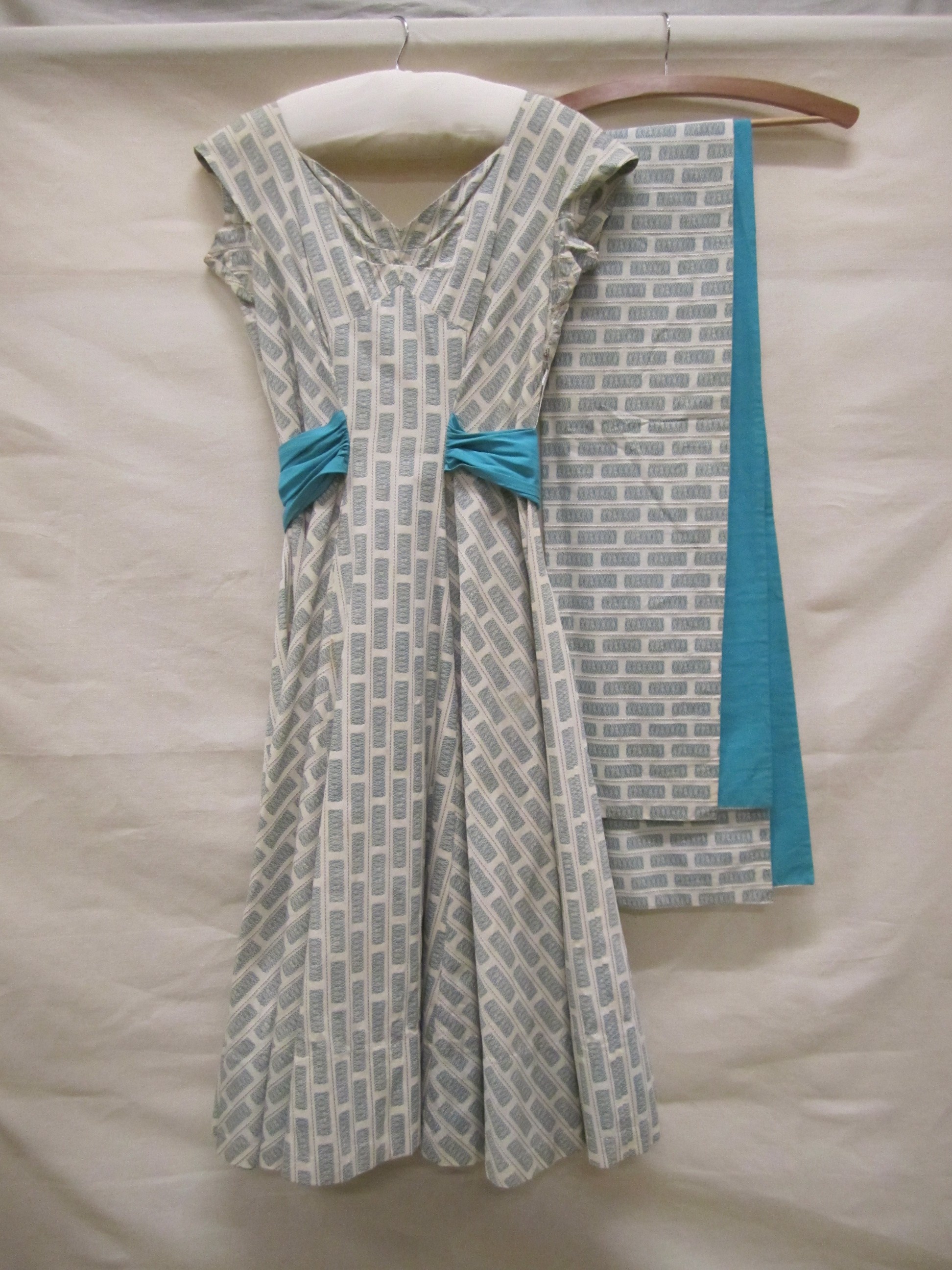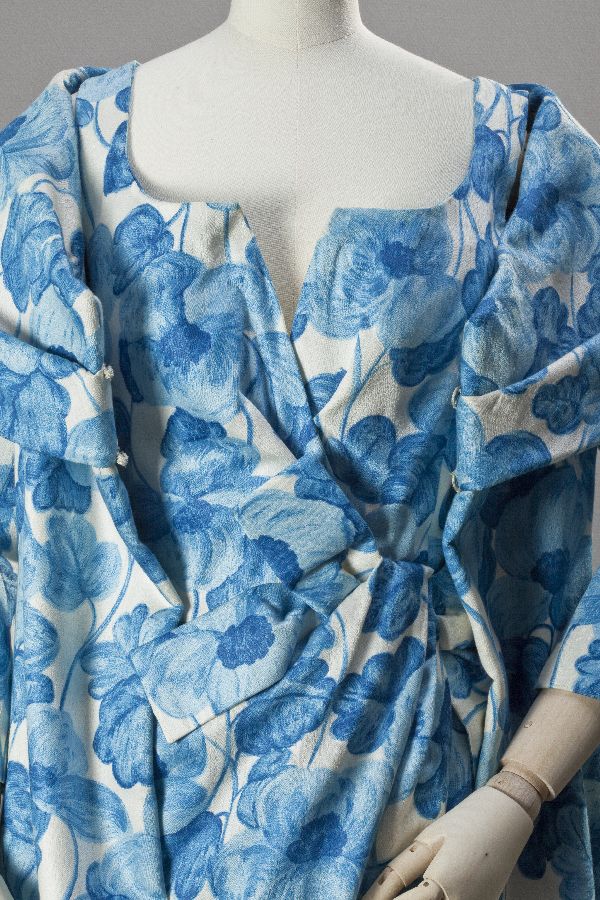 Avondjurk en mantel van chiné-satin bedrukt met blau...