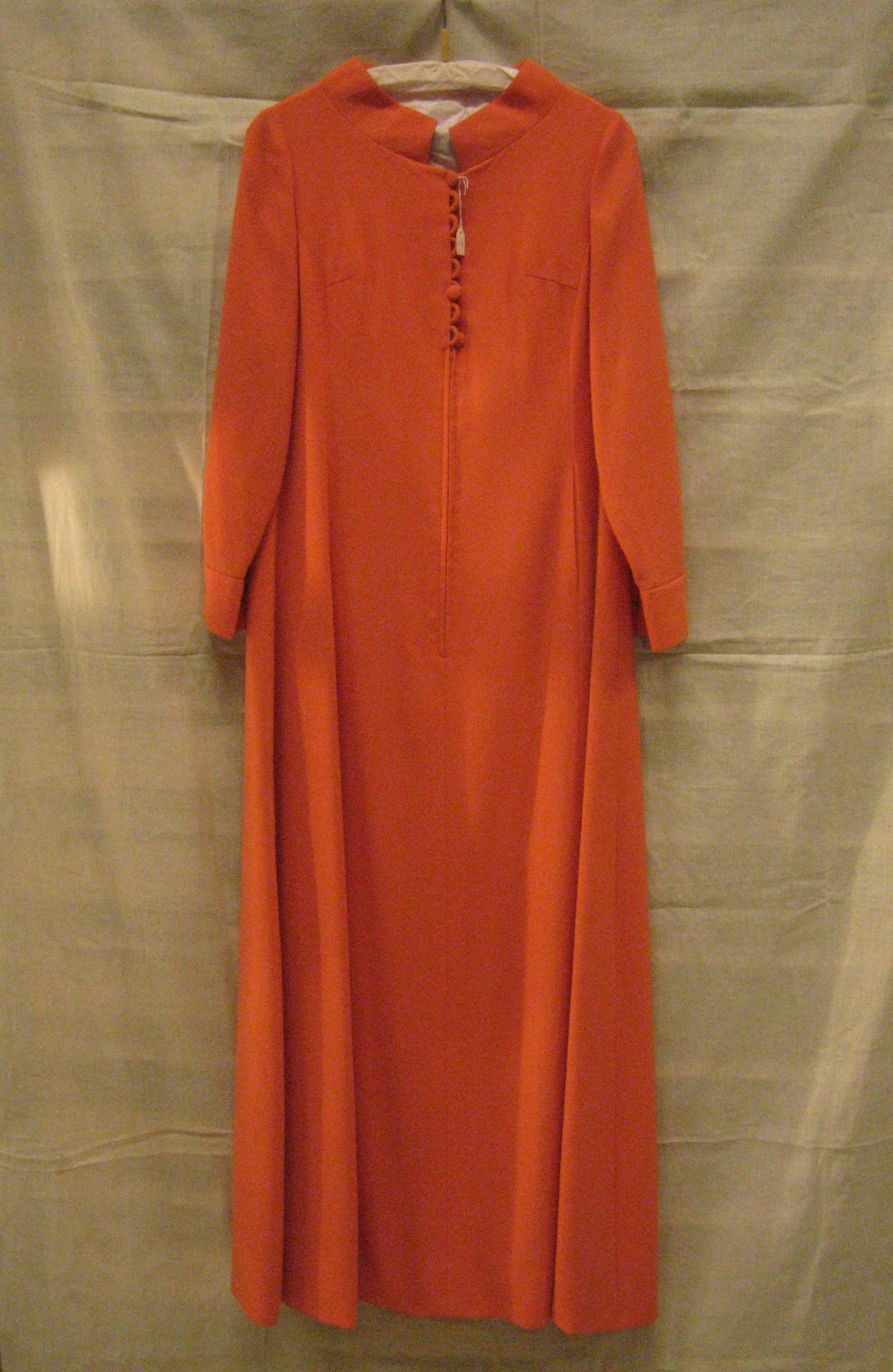 Avondjurk van oranje wollen crêpe, lang model met pr...