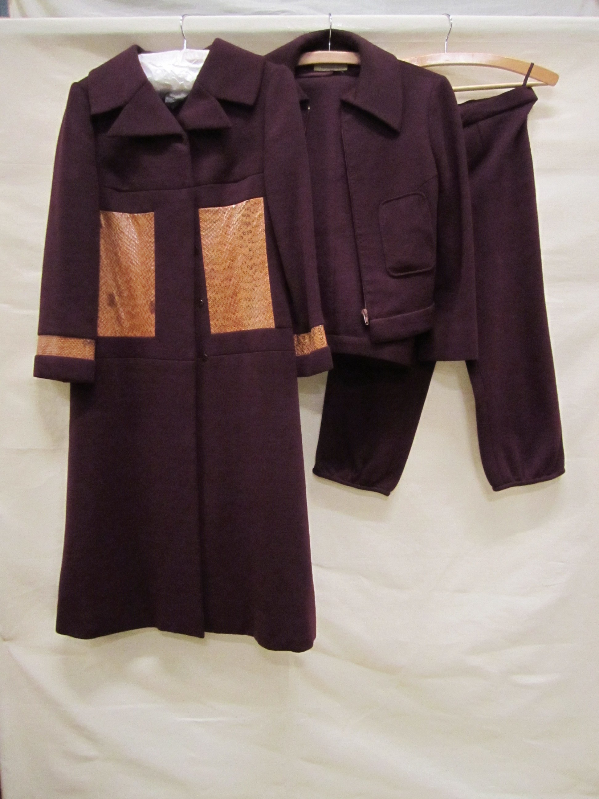 Driedelig ensemble van wollen tweed in rood, blauw, ...