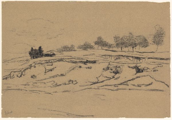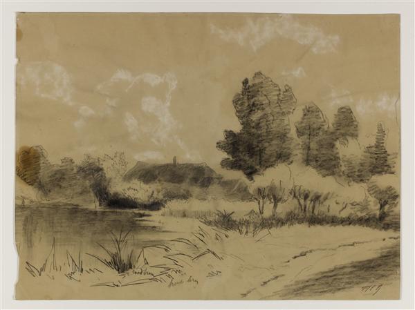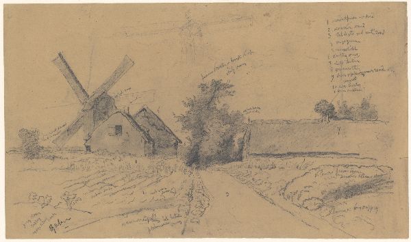 Weg met boerderijen en molen (vz); Schets van bomen ...
