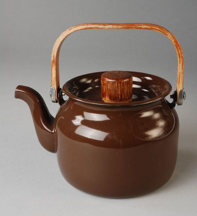 Bruin emaillen theeketel (A) met deksel (B) van Van ...