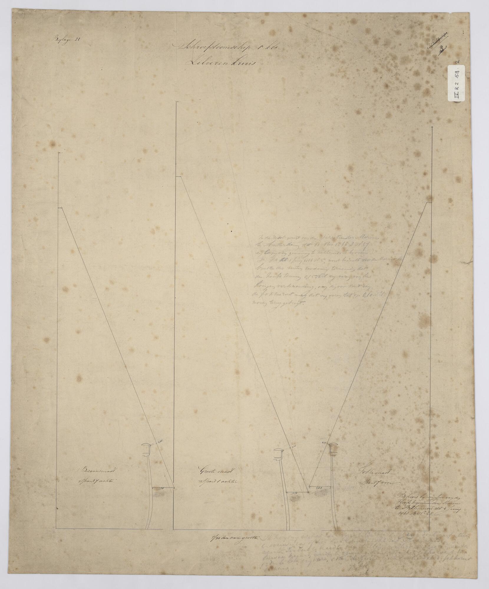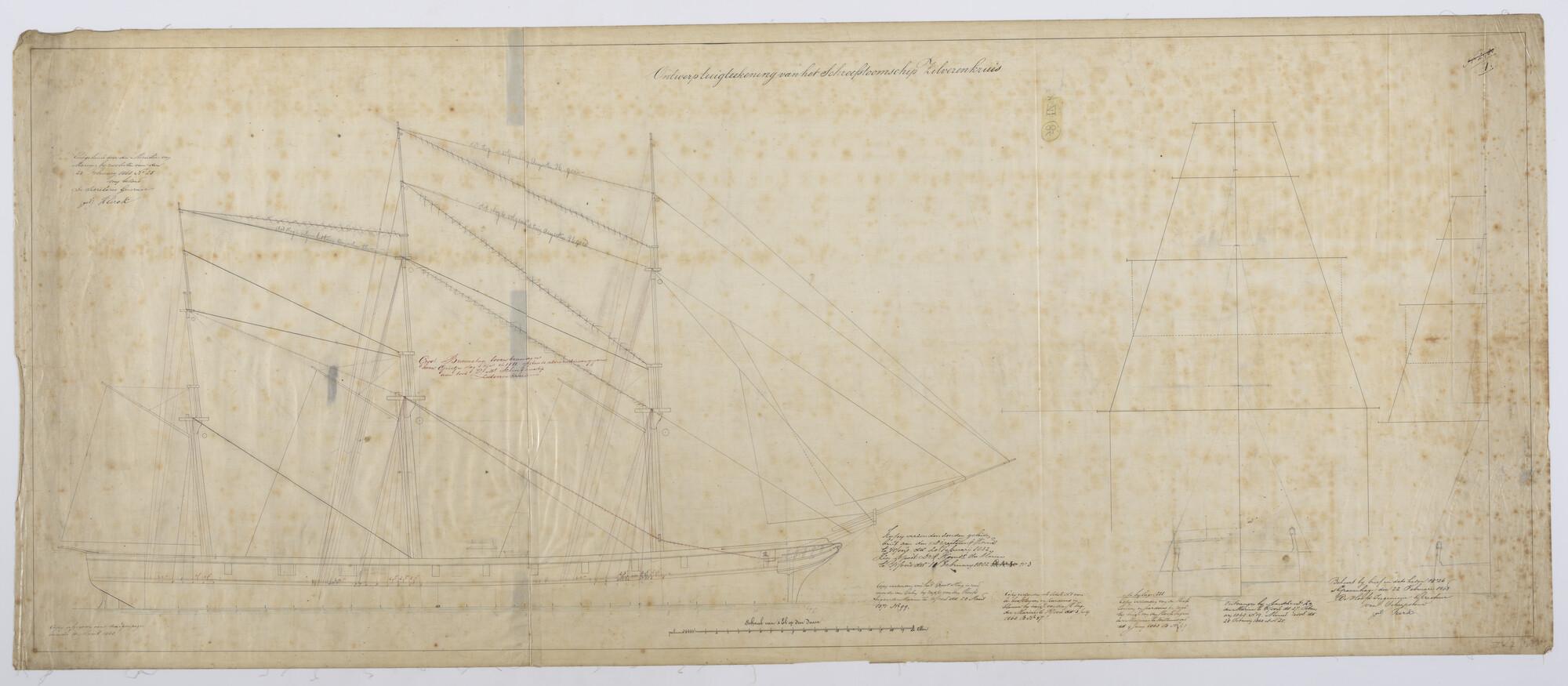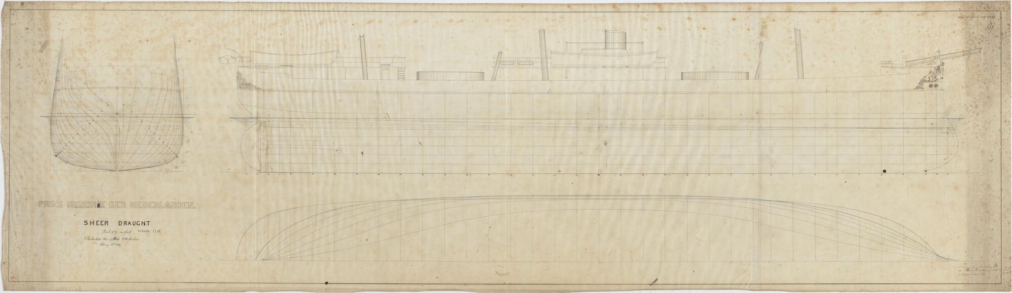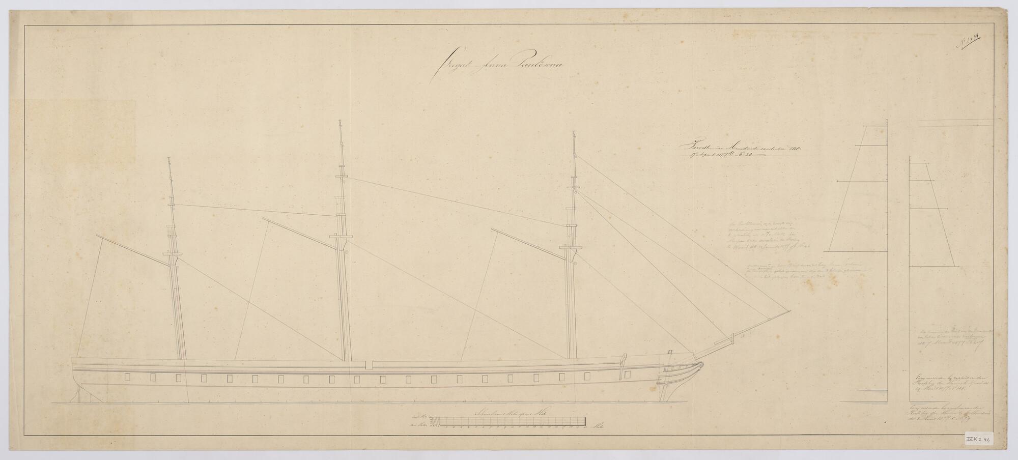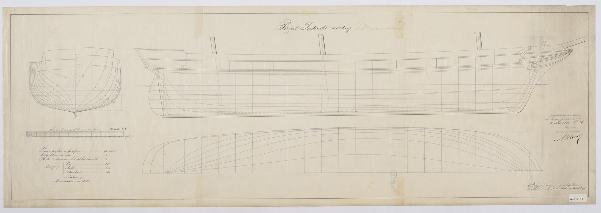 Het korvet Zr.Ms. Urania, 1856: zijaanzicht, lijnenplan