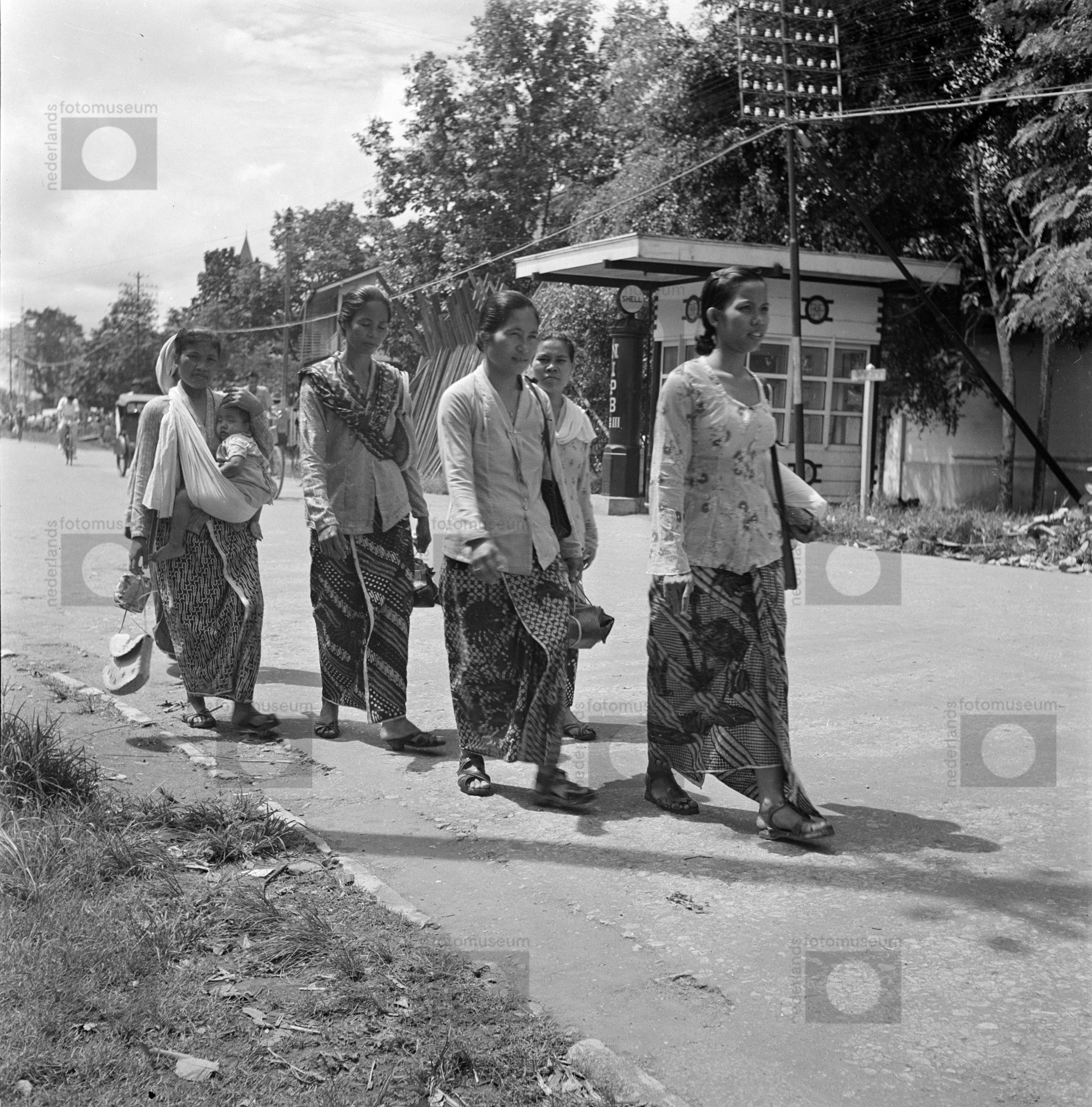Een groep vrouwen loopt over een straat, Indonesië (...