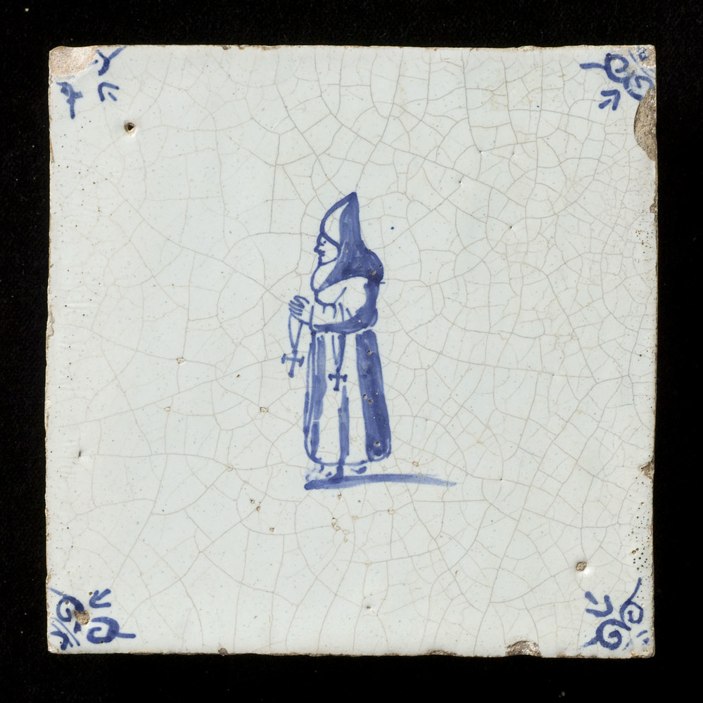 Tegel in tinglazuur, voorstellende monnik met kruis ...
