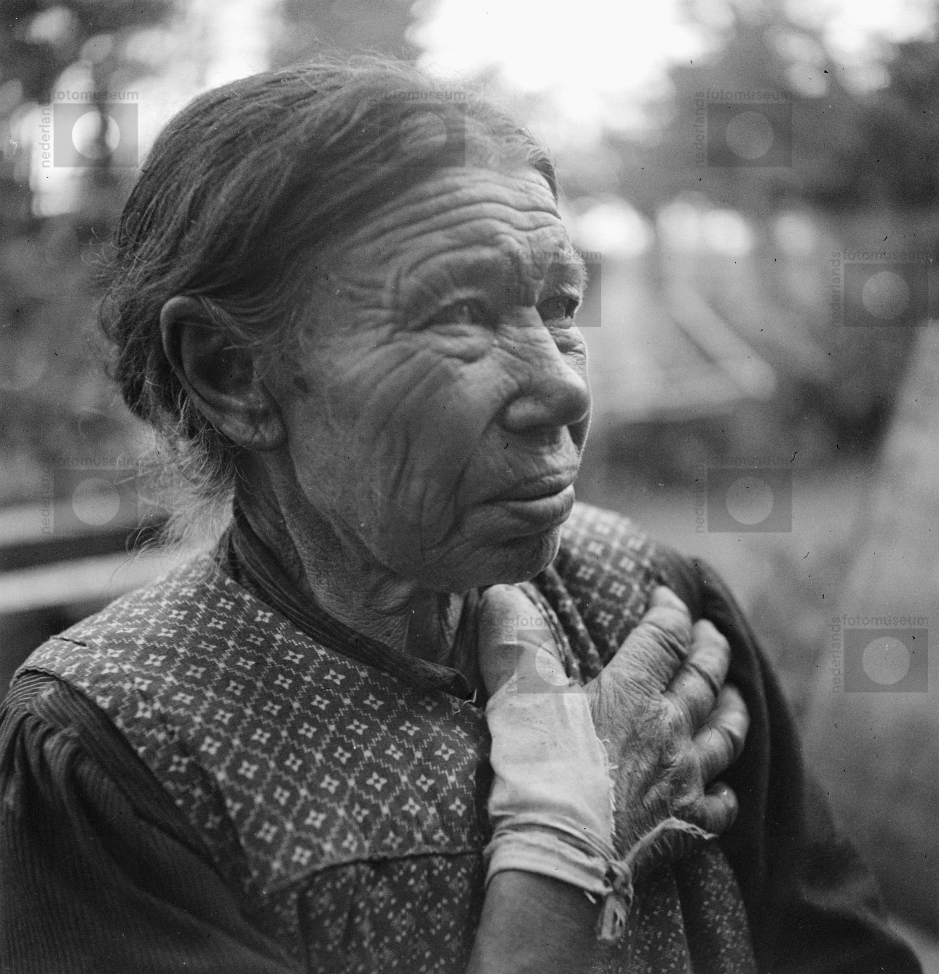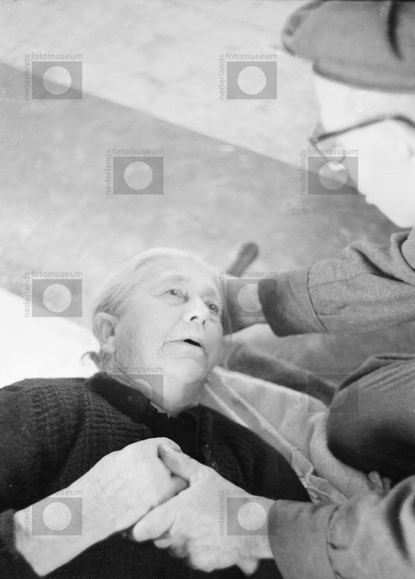 Hulp aan oude vrouw na de Watersnoodramp, Zeeland (1...