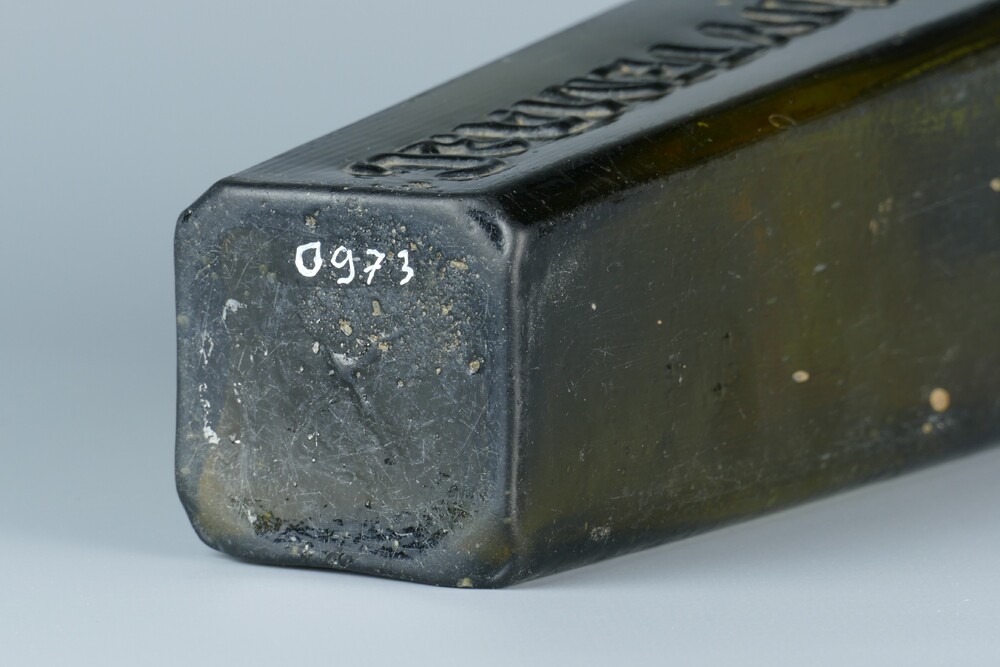 jeneverfles van groen glas, vervaardigd op de glasfa...