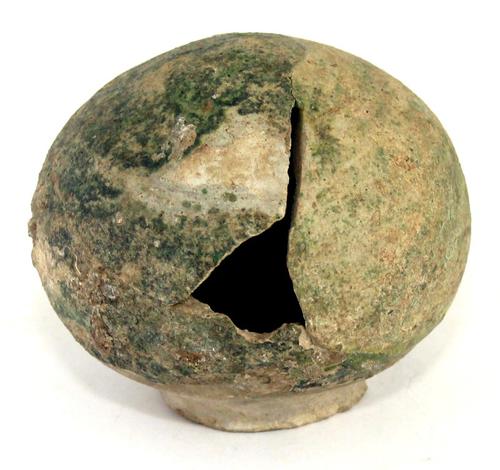 Spaarpot. Bolvormige grijs groene aardewerken pot, ...