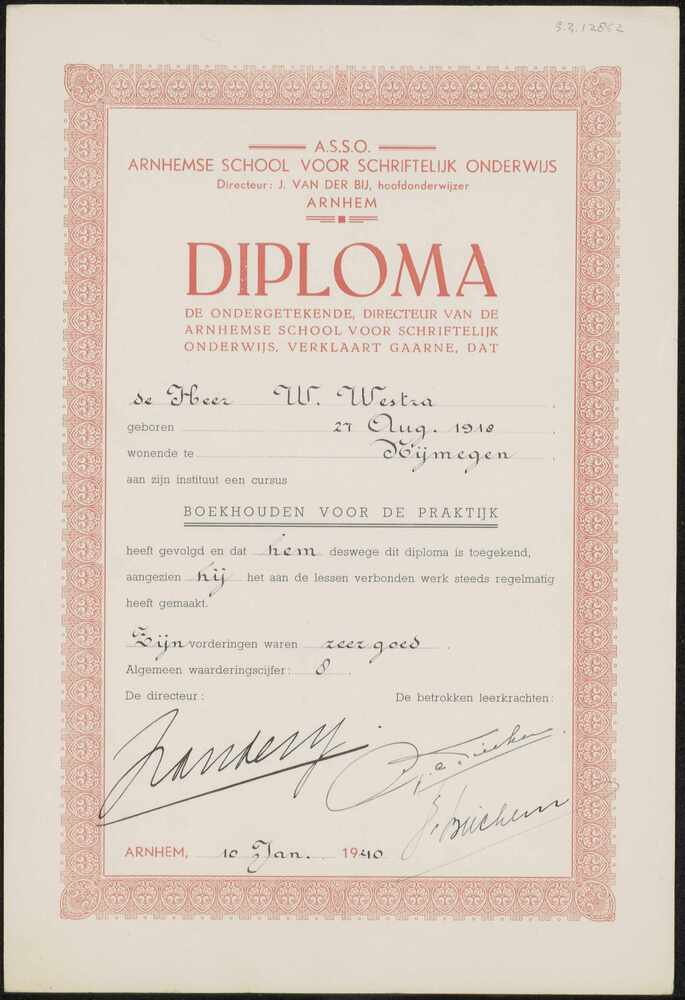 Diploma praktijk boekhouden op naam van W. Westra, g...
