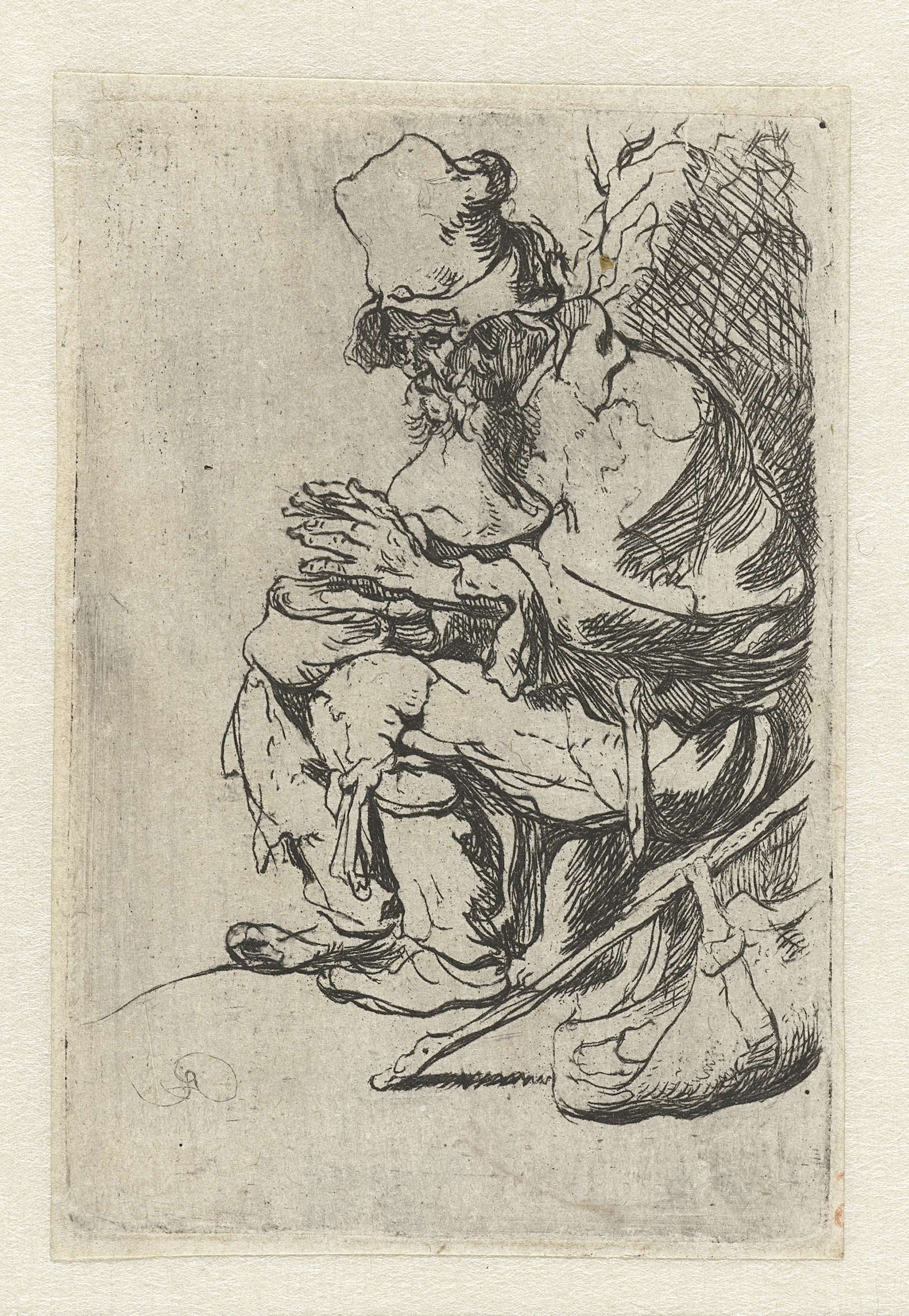 Beggar seated warming his hands at a chafing dish