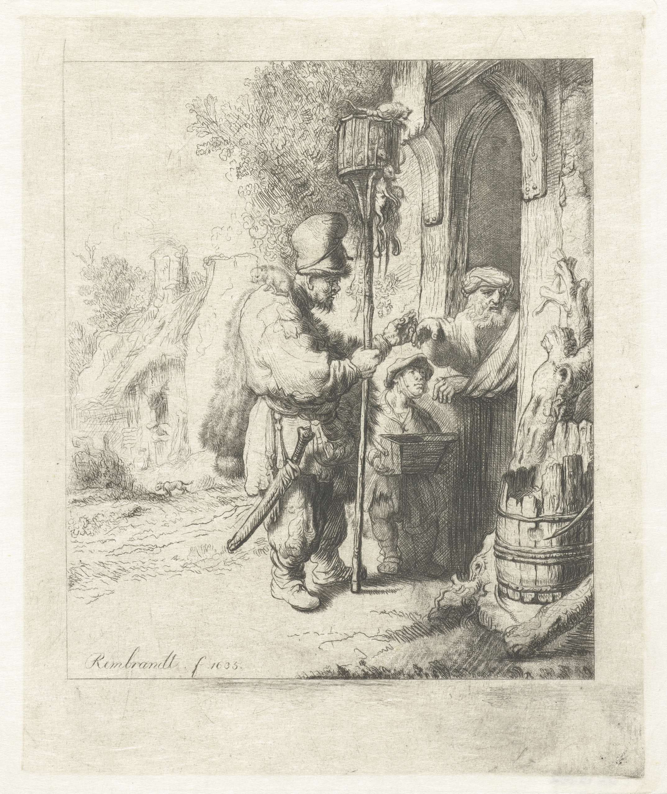 A blind hurdy-gurdy player and family receiving alms