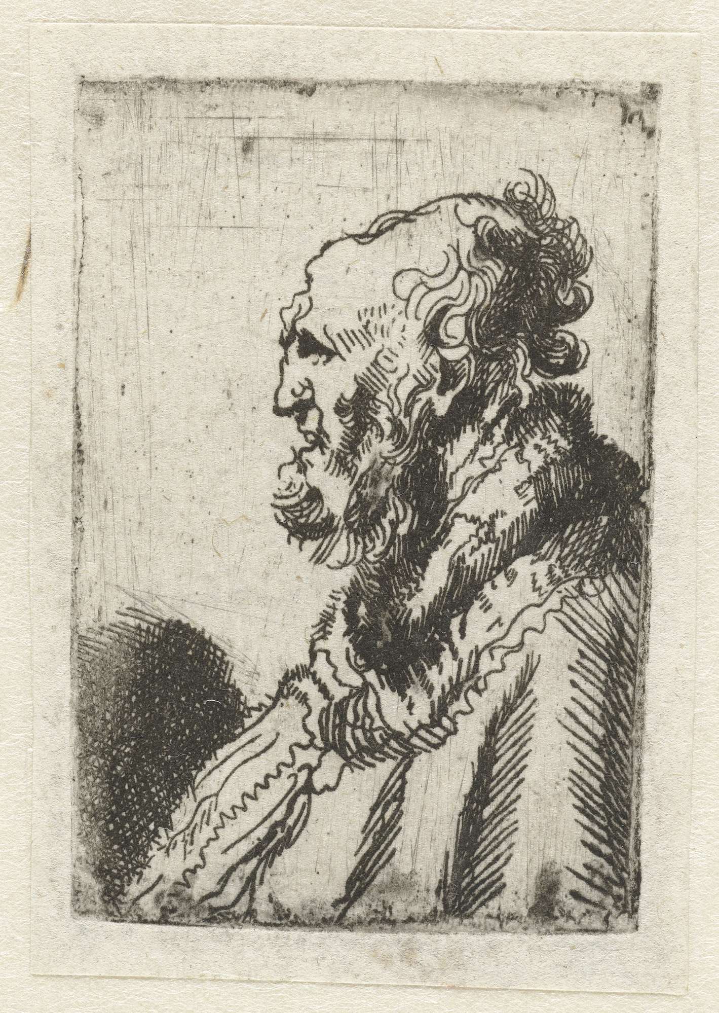 Bald old man with a short beard, in profile right