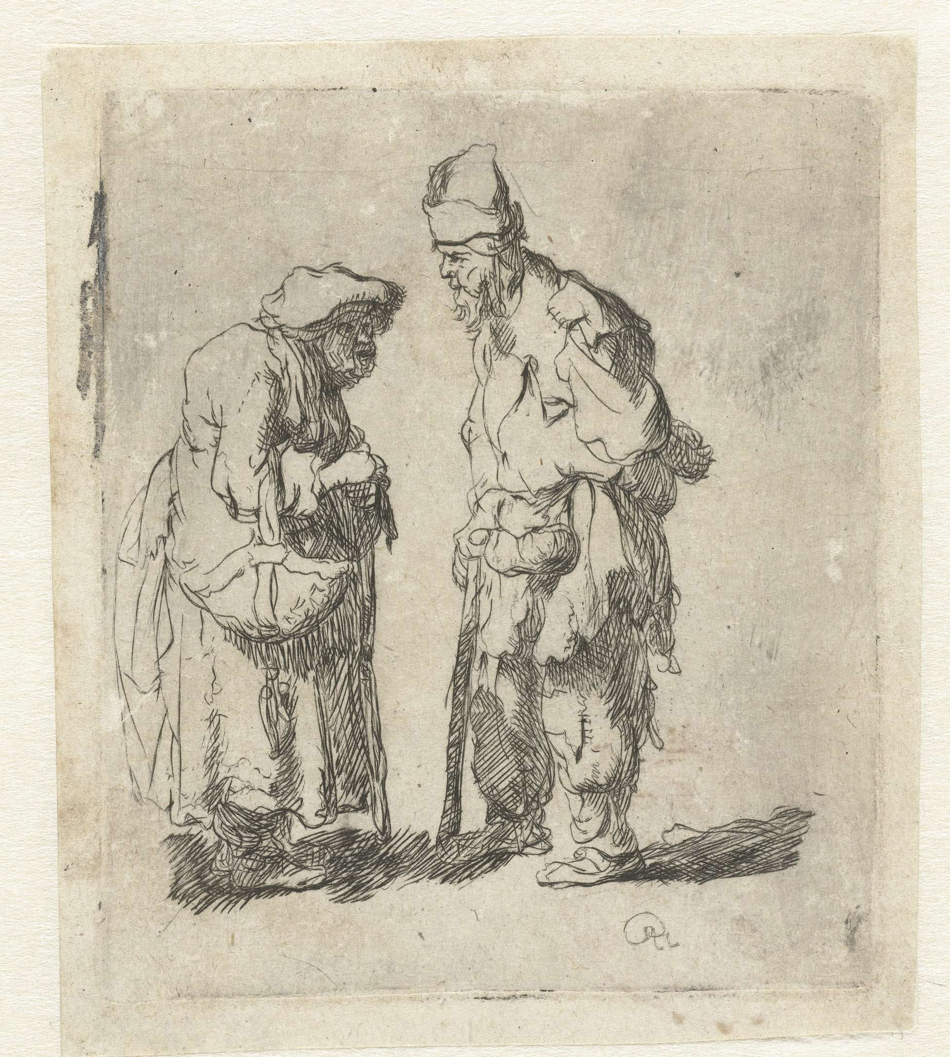 Beggar man and beggar woman conversing