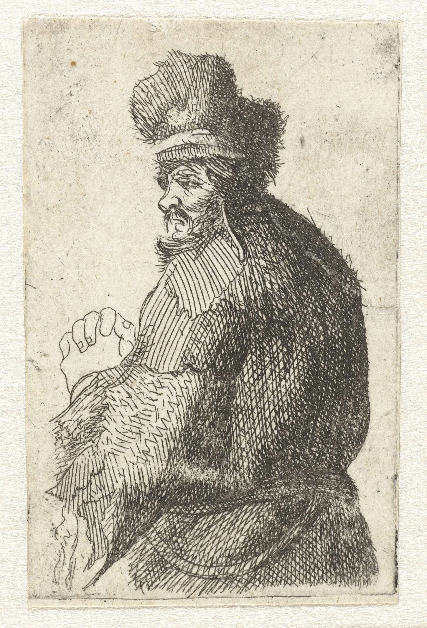 Old man seen from behind, profile right: half figure