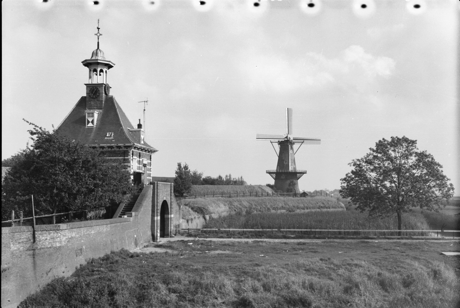 Poort en ronde stenen stellingmolen van voren gefoto...