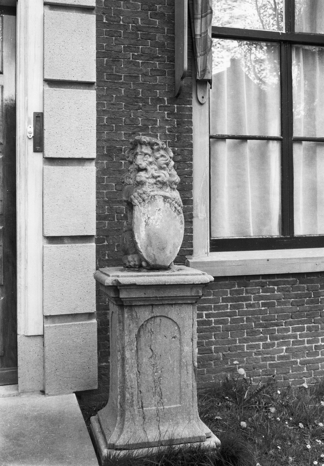 Een van de twee leeuwen die op de hekpijlers staan. ...