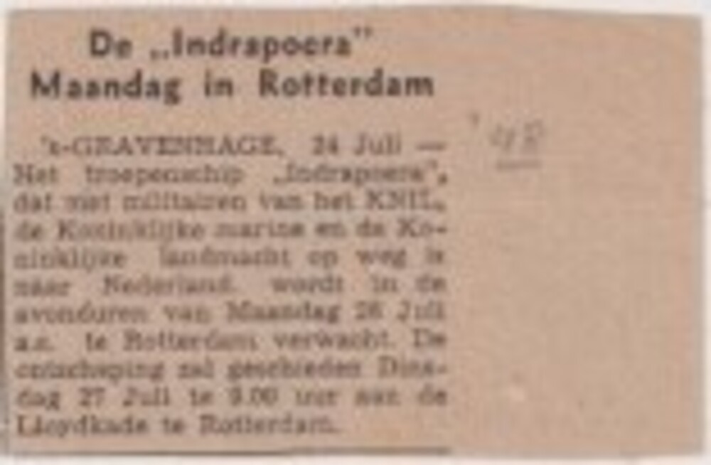 Krantenknipsel van 24 juli 1948 over aankomst van he...