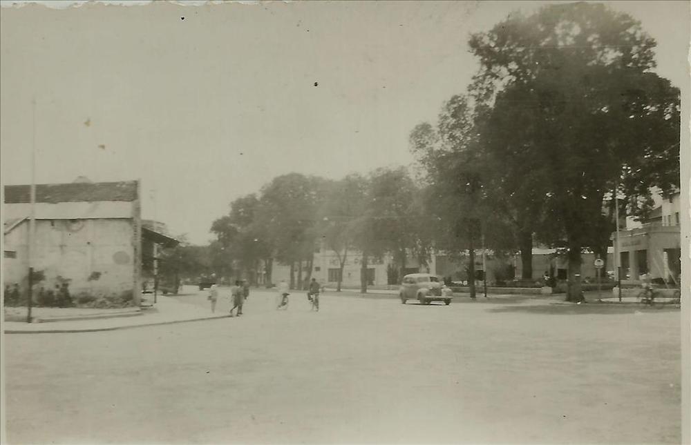 Nederlands Indië; stadsgezicht, straat, fietsers, au...