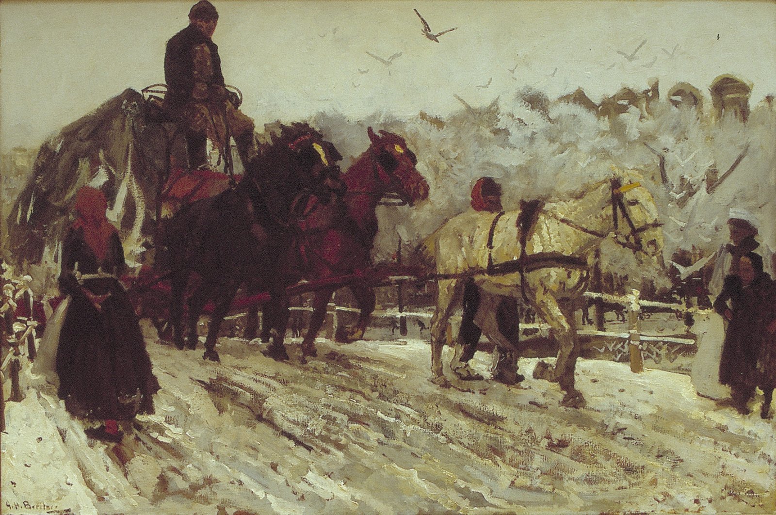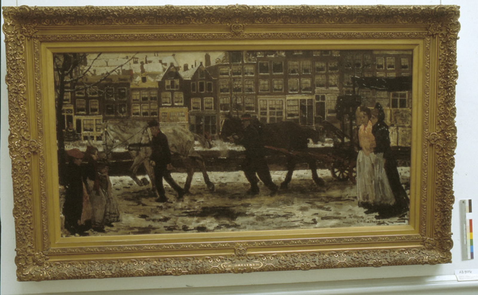 Werkpaarden in de sneeuw op de Prinsengracht in Amst...