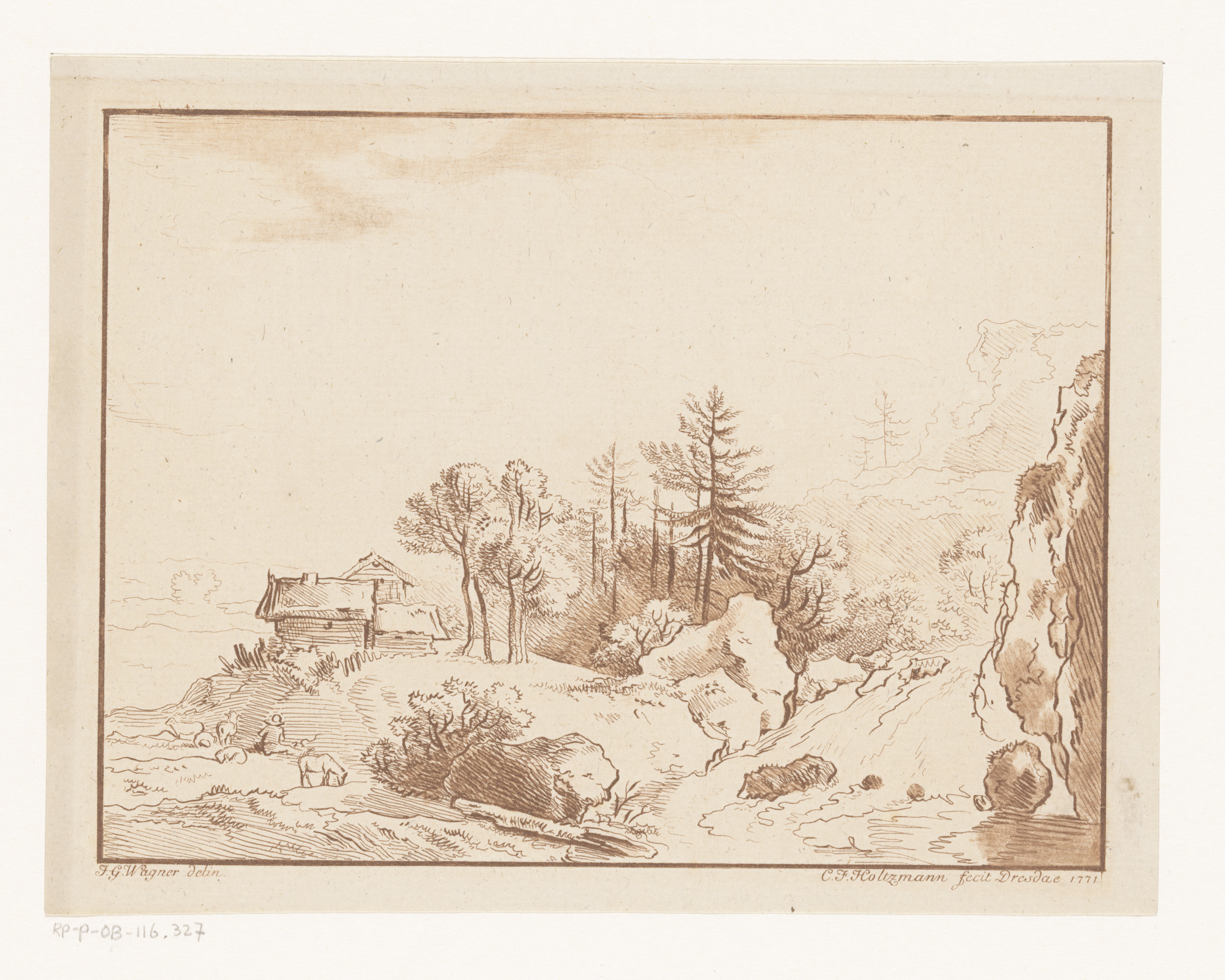 Heuvellandschap met herder bij een hut en waterval