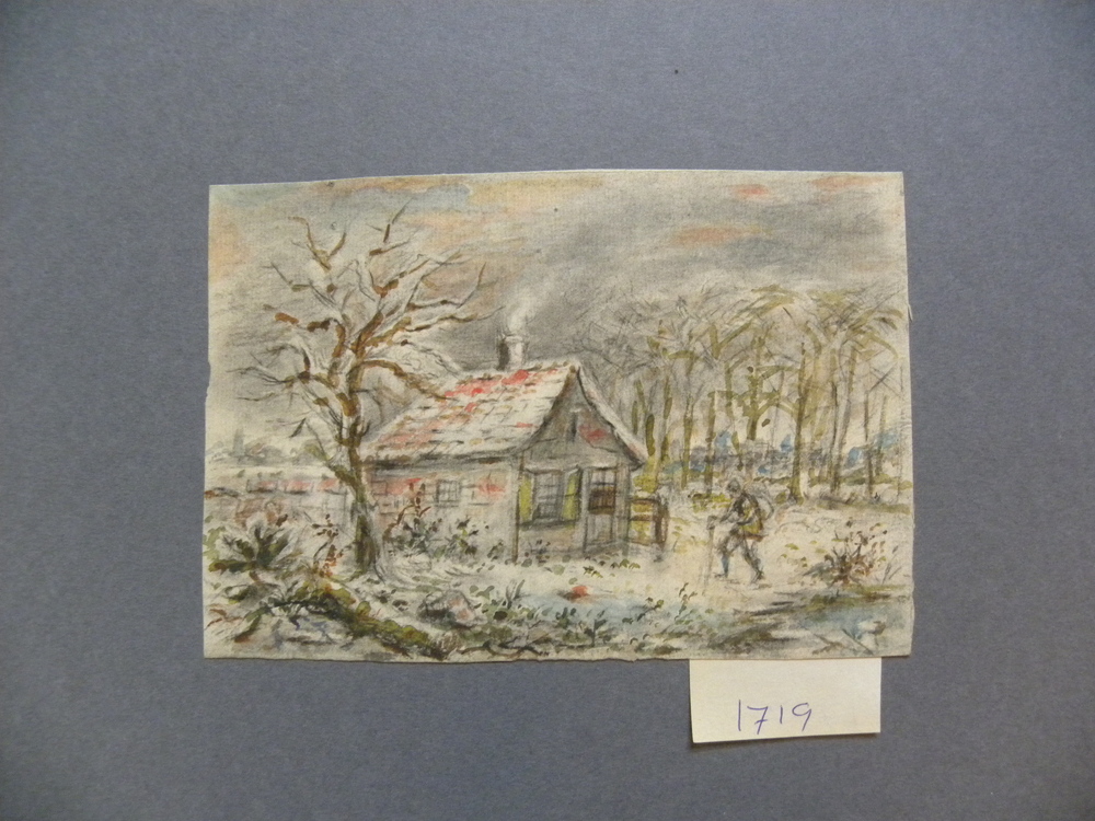 Aquarel voorstellende man bij huisje, ca. 1870.