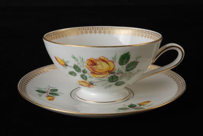 Theekop (A) en schotel (B) met geel bloemmotief van ...