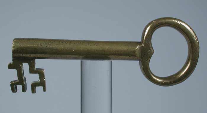 Grote koperen sleutel met gegraveerde tekst: "J.M. V...