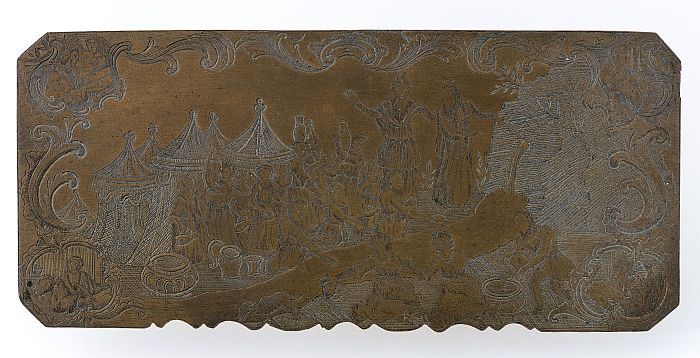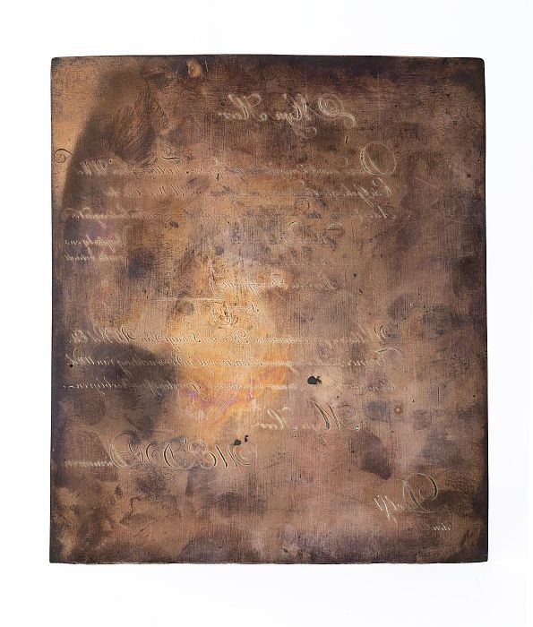 Koperen cliché met twee afbeeldingen, één bijbeltafe...